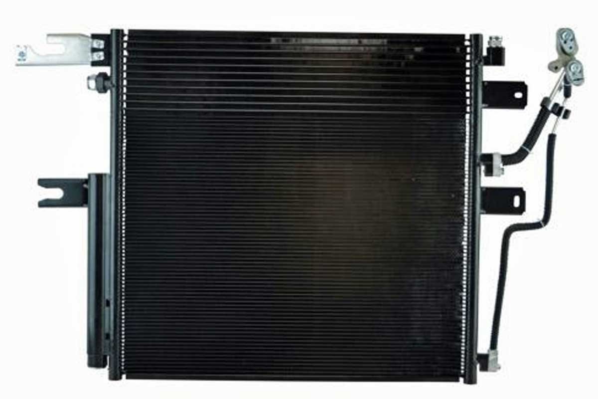 Top: Years ago, we added an external transmission filter on our Dart. The temperature probe was installed into the filter adapter, which is in the hot transmission line. Above Left: Our 2012 Cummins has a “cooler module” that includes the AC condenser, receiver dryer, and at the top of the module, the transmission cooler. Above Right: The transmission cooler on our Dart is a tube and fin design with a dedicated 10-inch fan. It has handled the cooling needs of the transmission for over two decades.