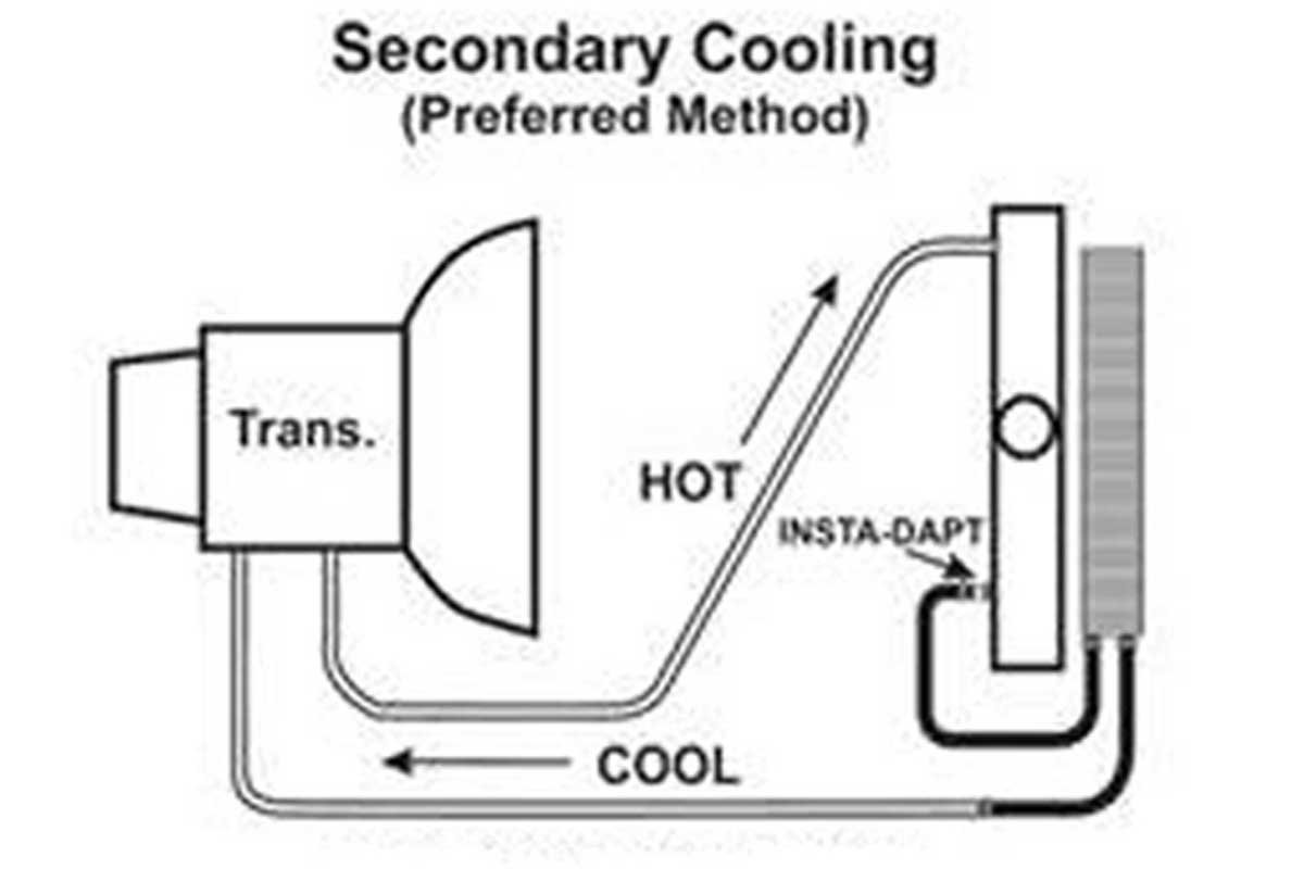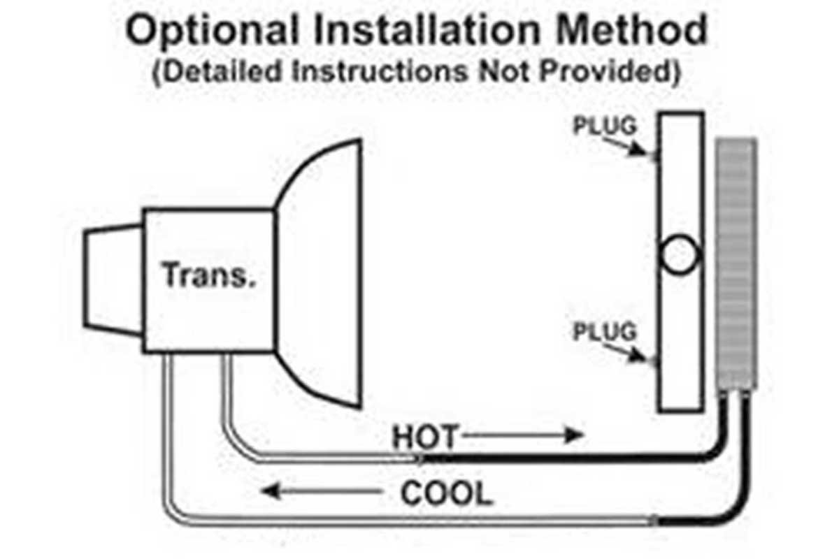 Above Left: When an external transmission cooler is added to a vehicle, the recommendation is to route the outlet trans line to the inlet to the external cooler. The fluid then is returned to the transmission. Above Right: Depending upon the GVW rating of the cooler, it may be beneficial to run the trans lines straight to the new cooler. The original cooler is plugged and not used.