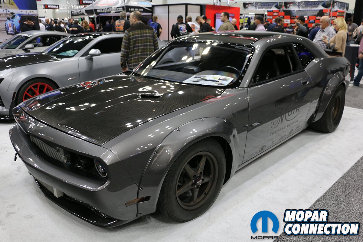 Above: This wide body Challenger supporting some type of forced induction, multiple carbon fiber parts, full cage and much more