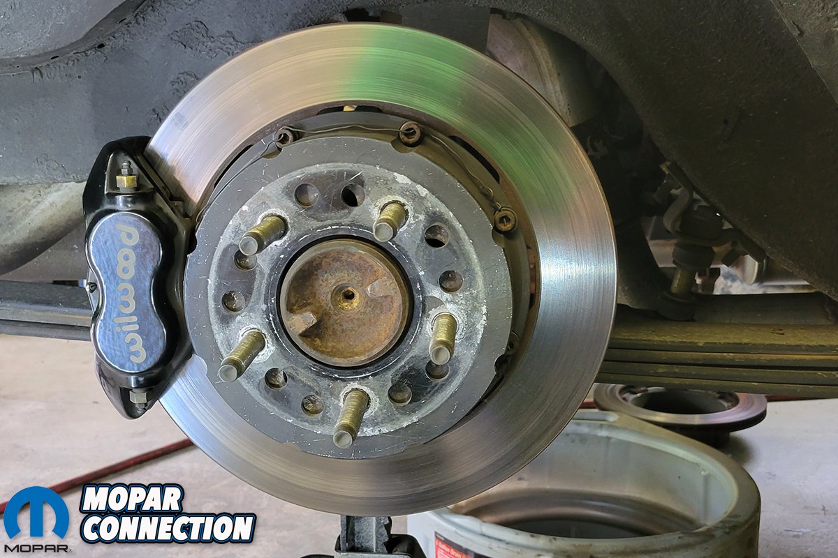 Above Left: We removed our brake calipers first by using a 9/16″ wrench. Above Right: With the caliper out of the way, remove your brake rotor.