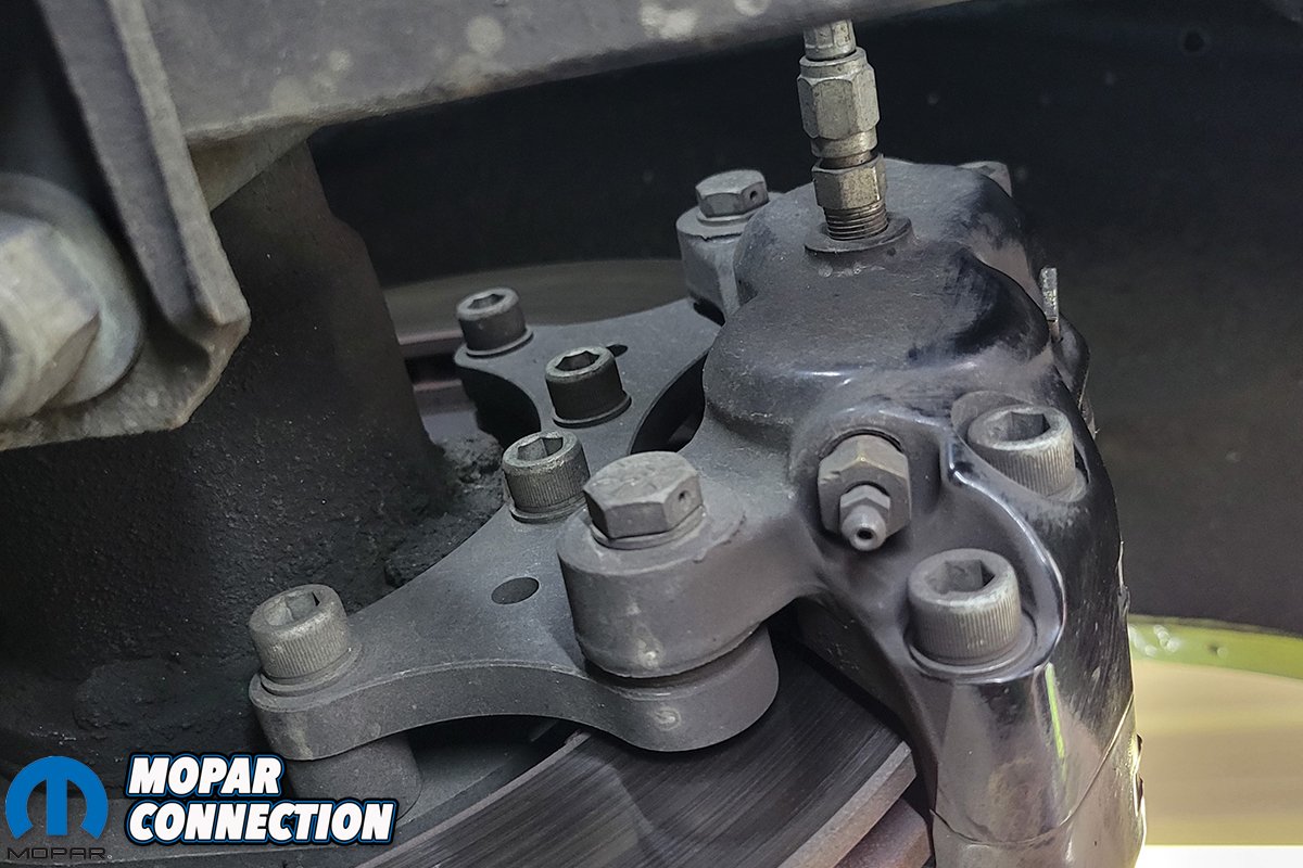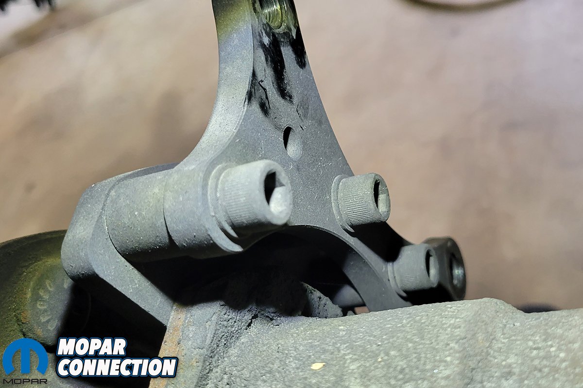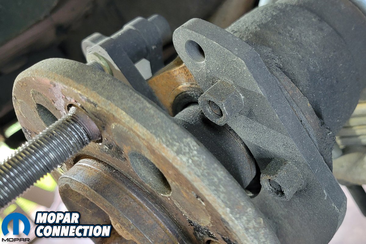 Above Left: Our rear brake setup sandwhiches the housing flange and needs taken apart a little further. Above Right: The allen bolt you see here needed to be removed so we could slide the caliper bracket off the studs.