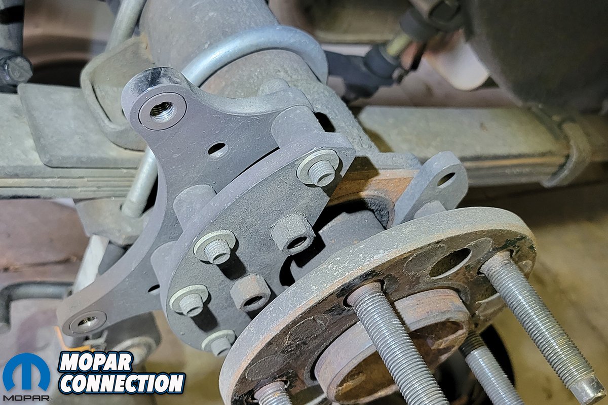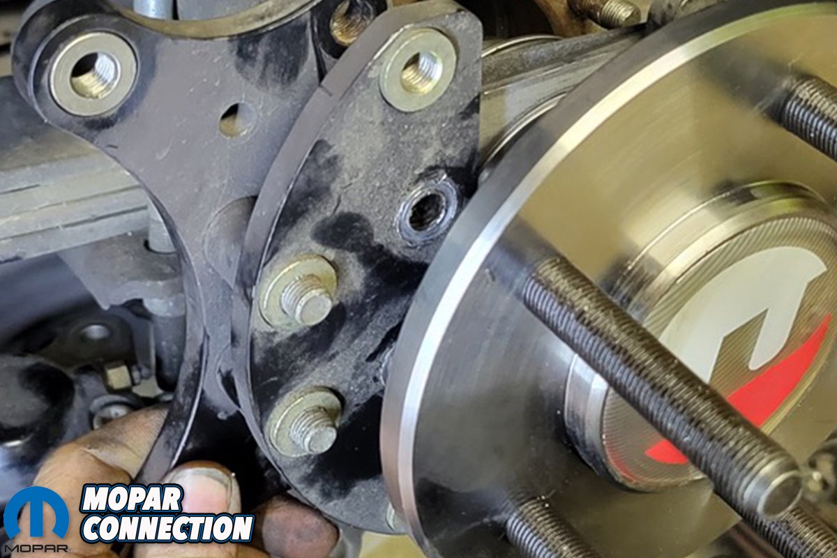 Above: Before the axle is completely in place, we had to slide our caliper bracket onto the housing first. Above Center: We reinstalled the bolt for the axle bracket and ready to slide the Moser axle in the rest of the way. Above Right: We finished up by torqing the nuts down for the axles and reinstalling the caliper.