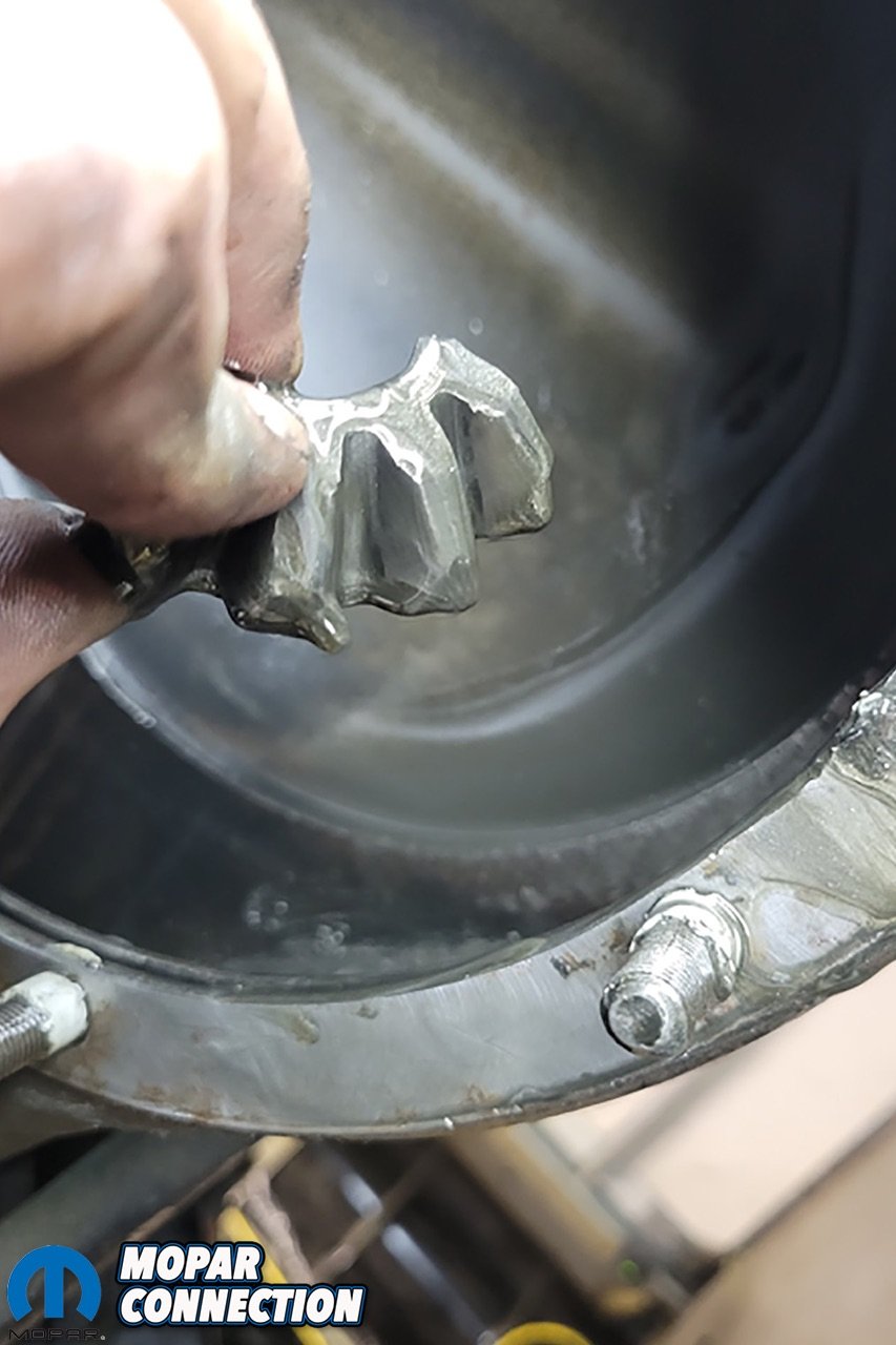 After removing the rear brakes and sliding the axle shafts out, we noticed that the ends of the splines on the axles were damaged. We continued on and removed the third member to further inspect. When draining the fluid there was a heavy silver tint and knew that was not a good sign.