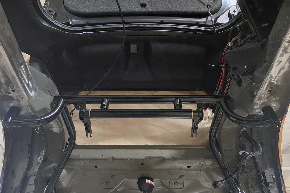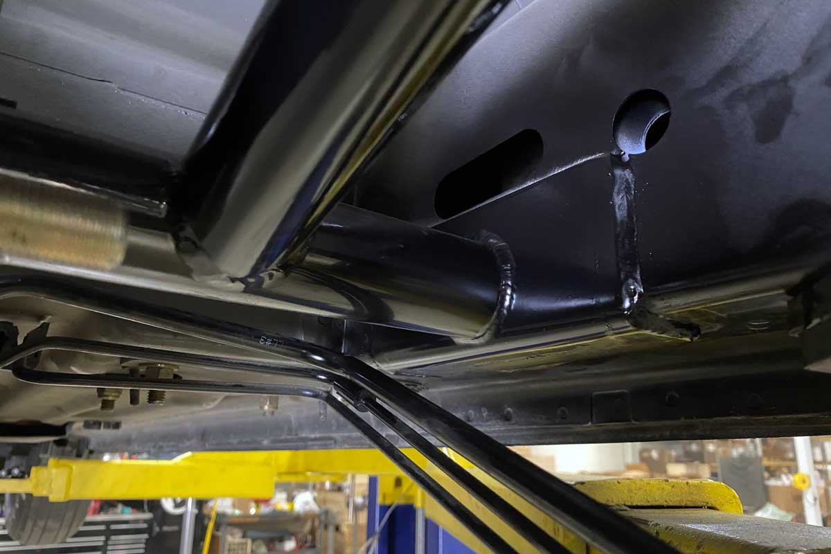 Above: The Moser subframe kit’s design efficiently positions the subframe assembly into the contours of the chassis. The subframe connector ties the front of the chassis to the rear. Any factory wiring or fuel system components were temporarily rerouted when installing the assembly. A plan for the location of the parts would be established after the installation of the subframe.