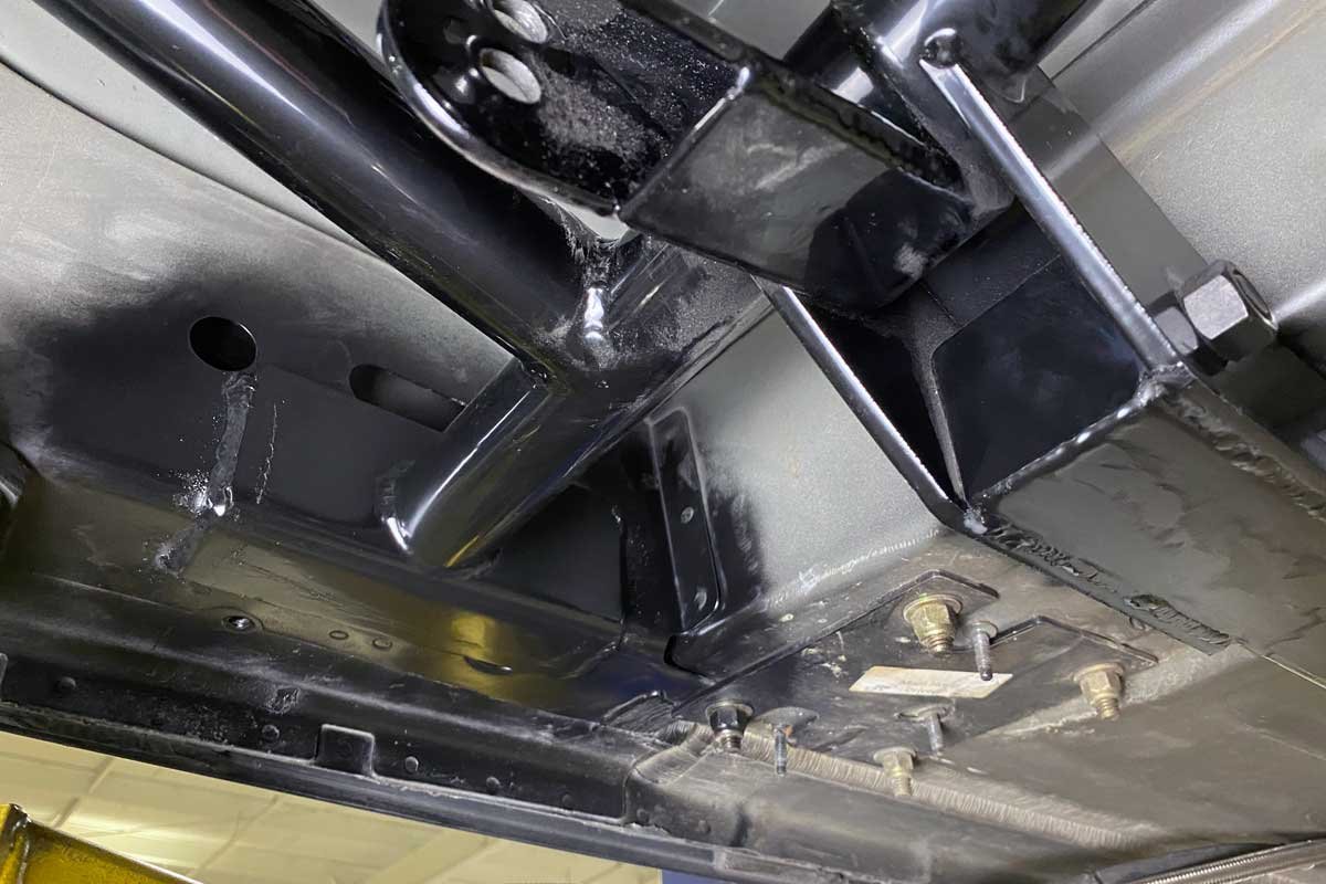 Left: The subframe assembly was test fitted, and the Challenger’s chassis was marked in the areas where welding would be required. After removing the paint and cleaning the marked spots on the Challenger, the subframe was supported and then welded and bolted to the chassis. Right: The same process of fitting, marking, cleaning, and welding was performed on the subframe connector.
