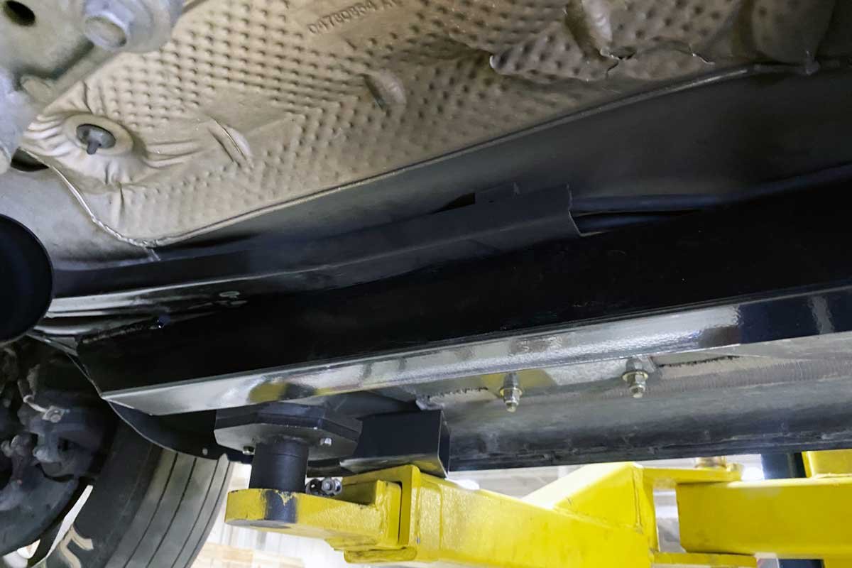 With the subframe installed, mark the rocker panels at the two weld plates of the rear subframe. Once marked, remove the subframe. Continue by clearing the paint, undercoating, etc. at the points of the marks to ensure a clean surface for welding. The same cleaning process is required on the weld plates. If the subframe weld plates do not tightly contact the rocker panels, using a jack will push the frame into place.