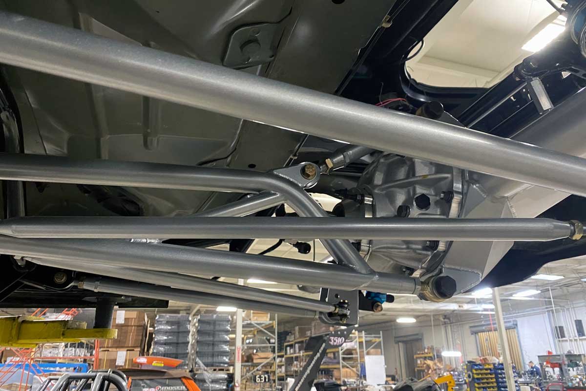 Upper Left: The track locator attaches to a bracket with multiple installation locations. The Heim joint allows for length adjustments as well. Upper Right: Both coil-over-shocks are set to a neutral position and can be adjusted after the component installation is completed. Lower Left: The torque arm extends to the rear-end housing. It attaches at the top and bottom of the housing. The upper link is used to set the pinion angle. Lower Right: The maze of links is more straightforward than it appears in the photo. Each link has a specific task, and once understood, the person setting up the suspension will know which to adjust, and how much adjustment is necessary.