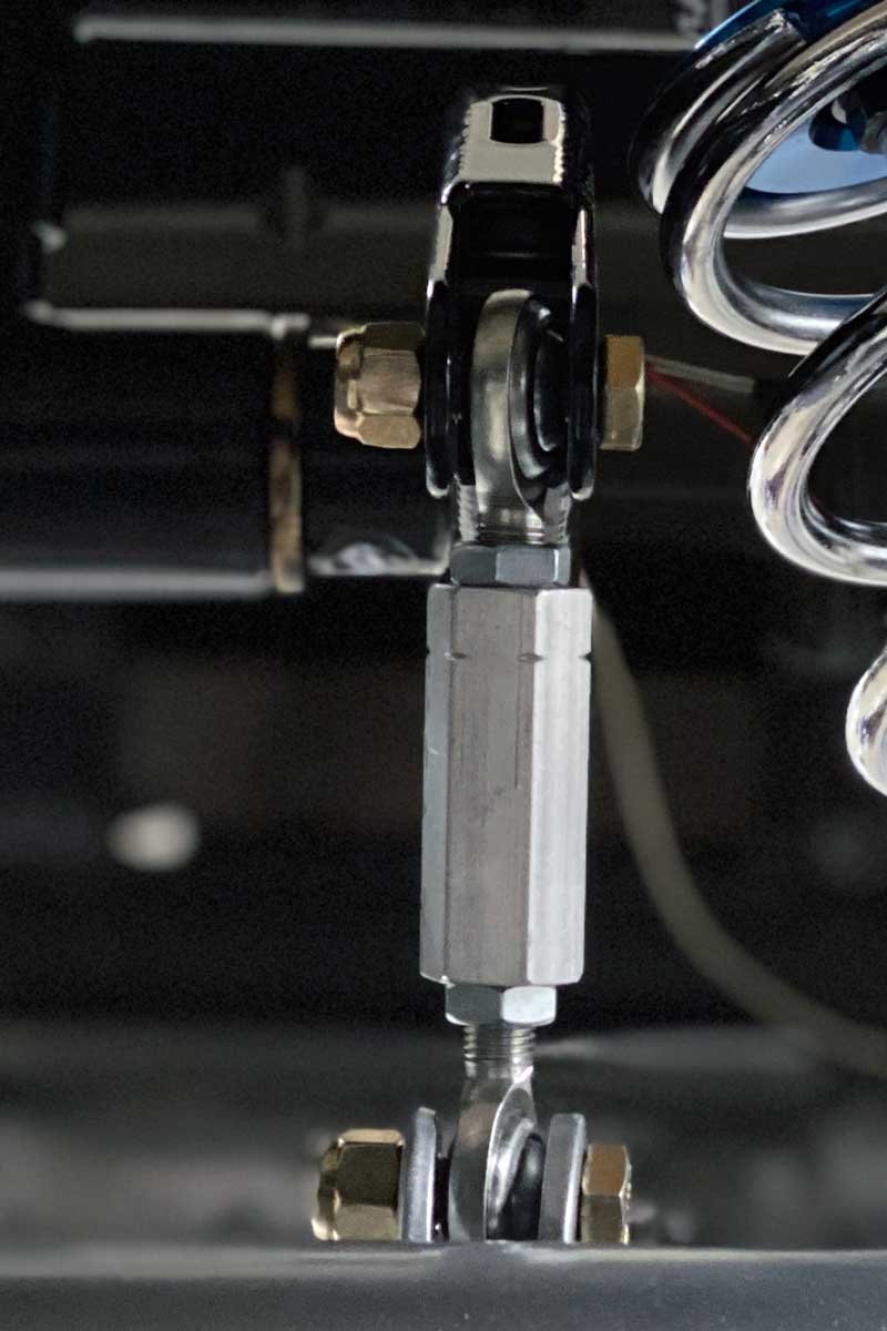 Left: The anti-roll bar end link (one per side) is between the bar and the axle housing. Each link is set to a neutral position. The links are tuned once the suspension is tested at the track. Right: The lower shock bracket was placed in the lowest pair of holes. The position may be changed depending on the application.