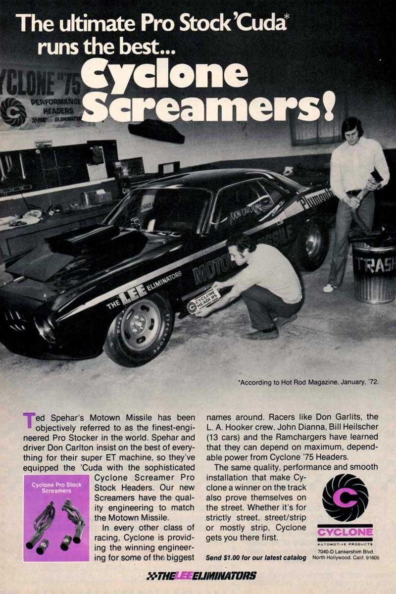Cyclone Automotive Products started selling headers in the 1960s that were known for performance and dependability. Then, in the early 1970s, Cyclone began an ad campaign for its latest header designs. Known as the “Race into Tomorrow with Cyclone ’75 Performance Headers – Years Ahead of Their Time,” Cyclone was able to push the engineering envelope by developing quality headers during the infancy of the Federal emissions directives.