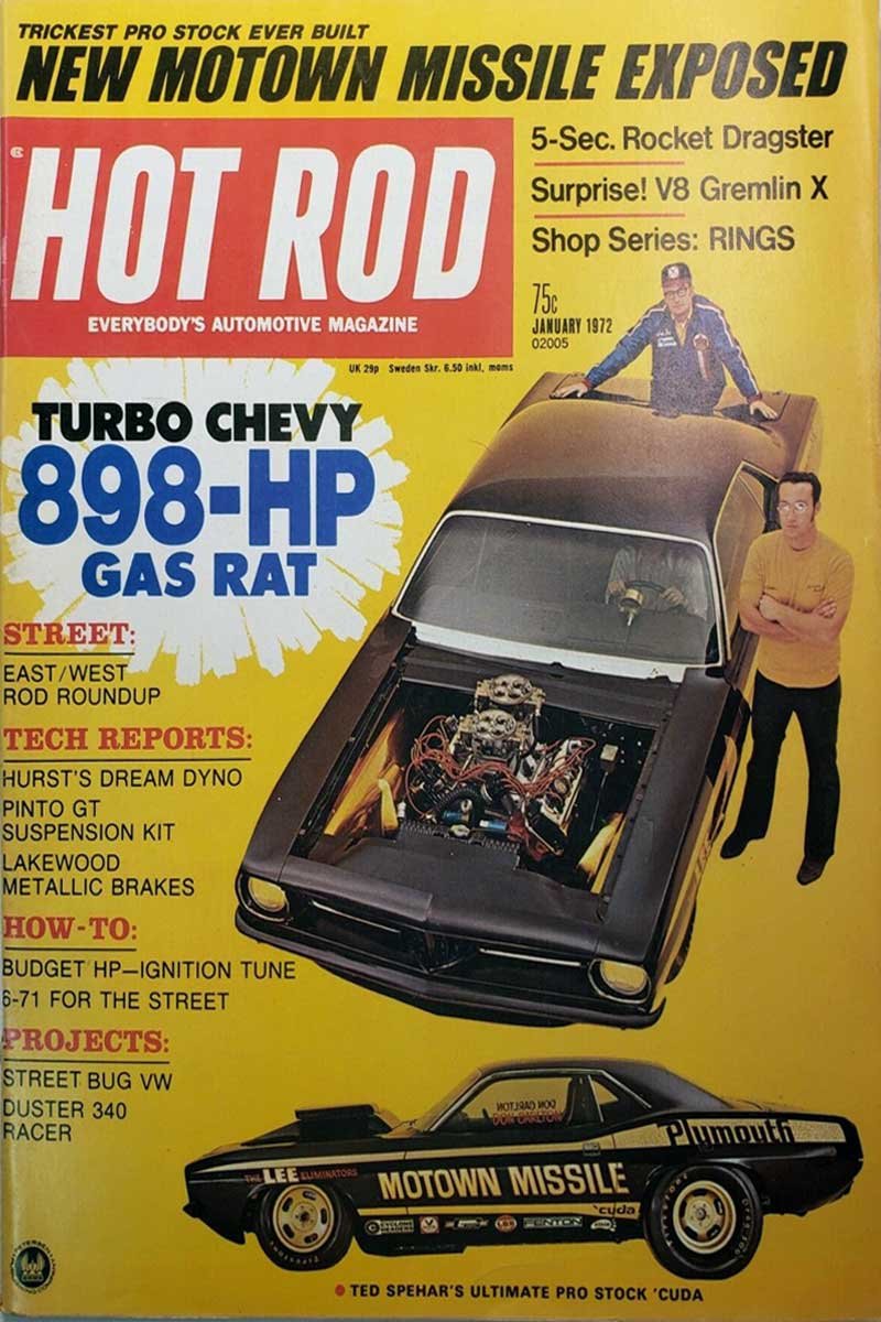 Above Left: The Motown Missile team added to Cyclone Headers for the 1972 season. The headers met the team’s high standards. The advertisement was featured in the October 1972 Super Stock & Drag Illustrated magazine. Above Right: The Motown Missile team earned the cover of the January 1972 Hot Rod magazine. A seven-page editorial covered the team’s advanced engineering to compete in the Pro Stock class.