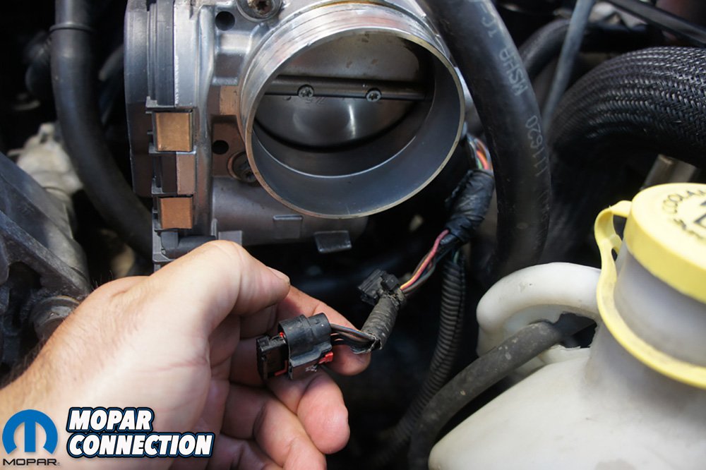Above Left: Unplugging the Electronic Throttle Control (ETC) can be a little difficult. Then there is a friction clip that needs pulled off under the throttle body. Above Right: With the ETC sensor disconnected, we can access the two 10mm bolts and lay the bracket and harness off to the side.