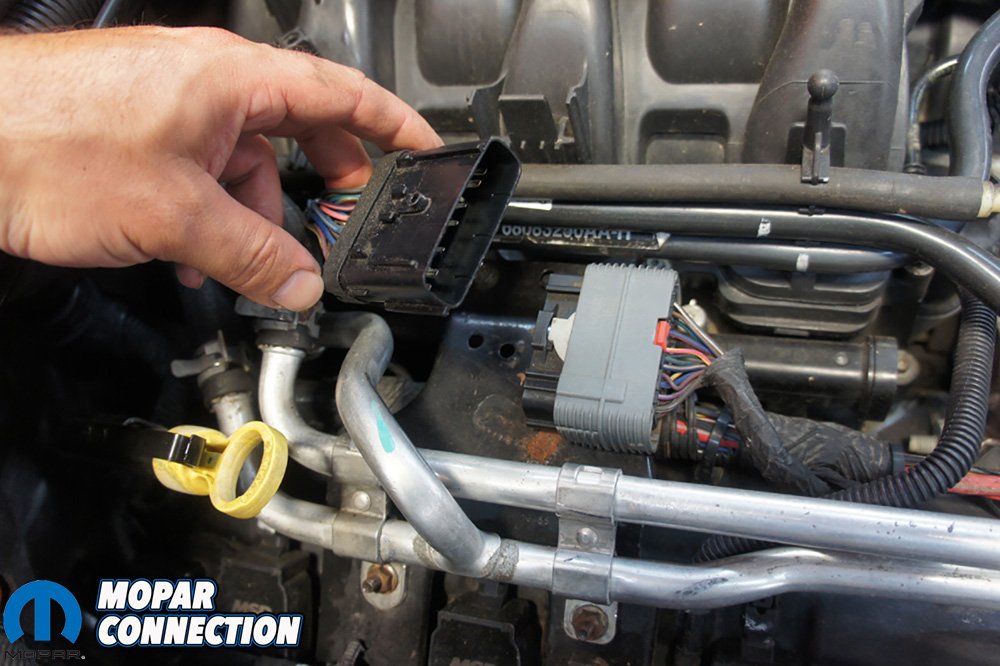 Above Left: With air intake removed, we move to passenger side of the motor and disconnect the main harness and lay it out of the way. Above Right: We pull the transmission breather and PCV hoses off the intake and set them to the side. Our one PCV hose goes to our JLT oil catch can instead of the intake, so your hoses might look slightly different.