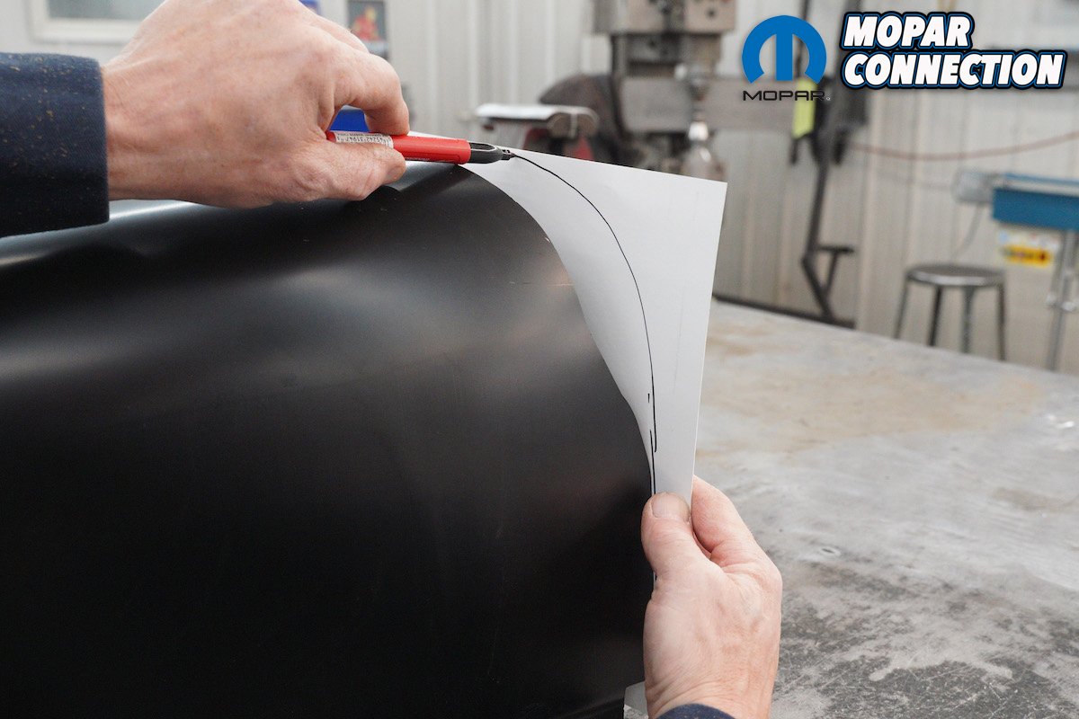 Above left: Because the inner half of the tub is about three inches wider than stock, the floor will have to be cut back to make room for it. To get a good idea of where to cut the floor, a template is drawn to the shape of the inner half of the tub. Above right: Using inner structures as reference points, the template is used to draw an approximate cut line on the floor. Approximate because a new lip about an inch wide will be formed that will be spliced into the floor. The same process will be done on the other end of the tub with the trunk floor.