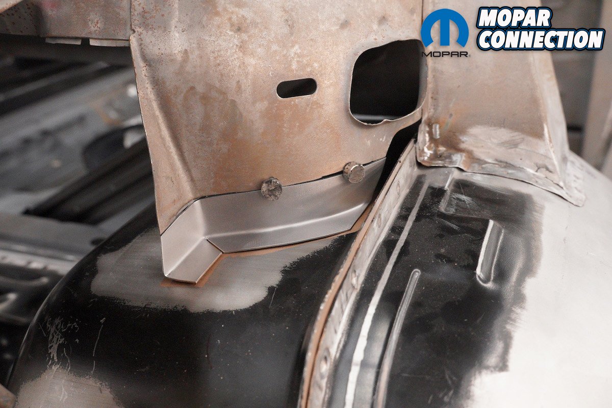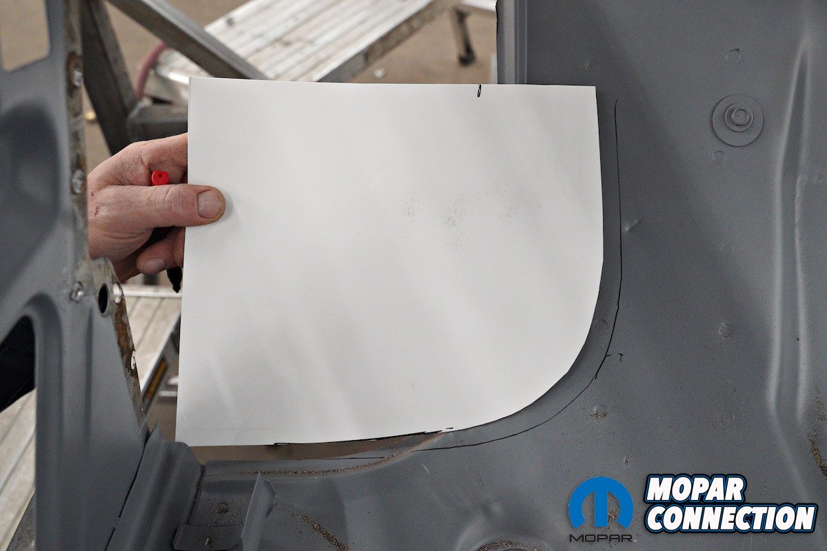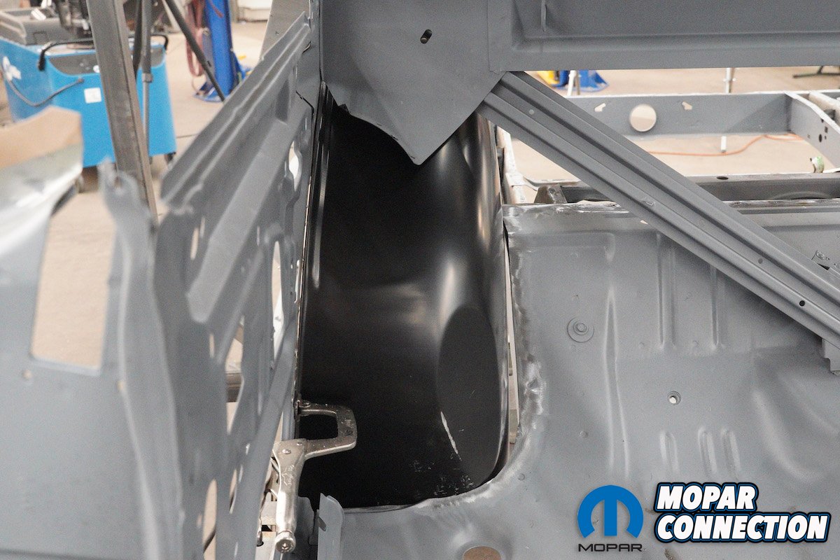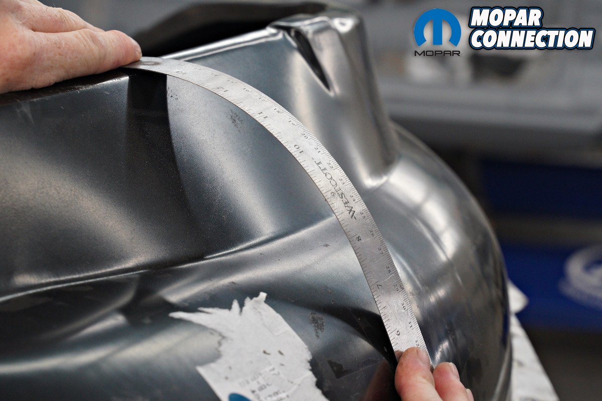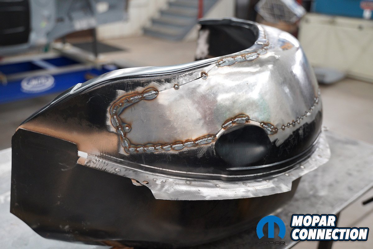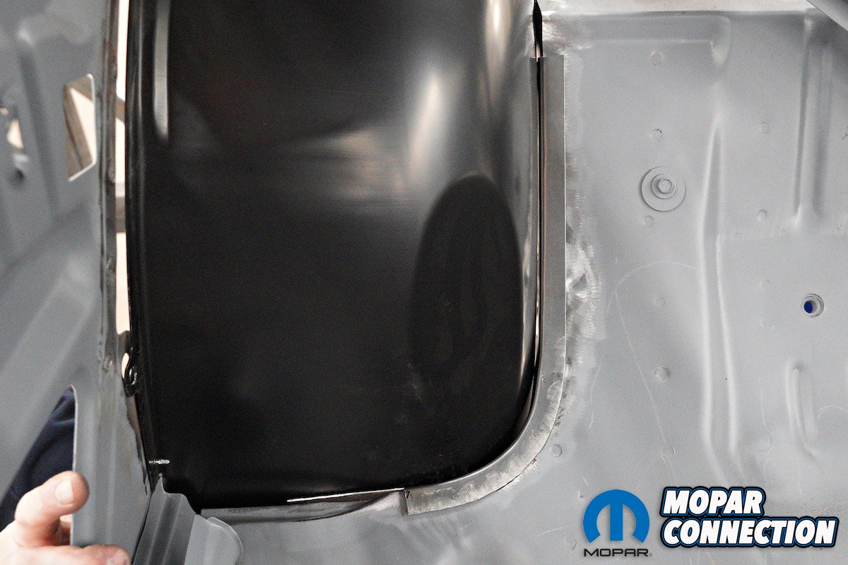 Chargers have more quarter room for tires than the stock outer tub will allow so MCR decided (well actually the car owner insisted on it) to take mini-tubs for B-bodies to the next level. 15 x 29 inch tires will not fit in a Charger wheel tub even if it is about three inches wider toward the frame rail for reasons you’ll see in a moment. But there is room inside the quarter itself so MCR modified the outer tub to take advantage of that space.