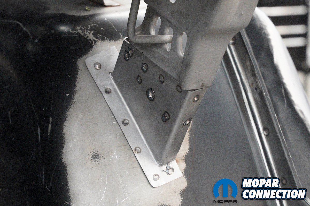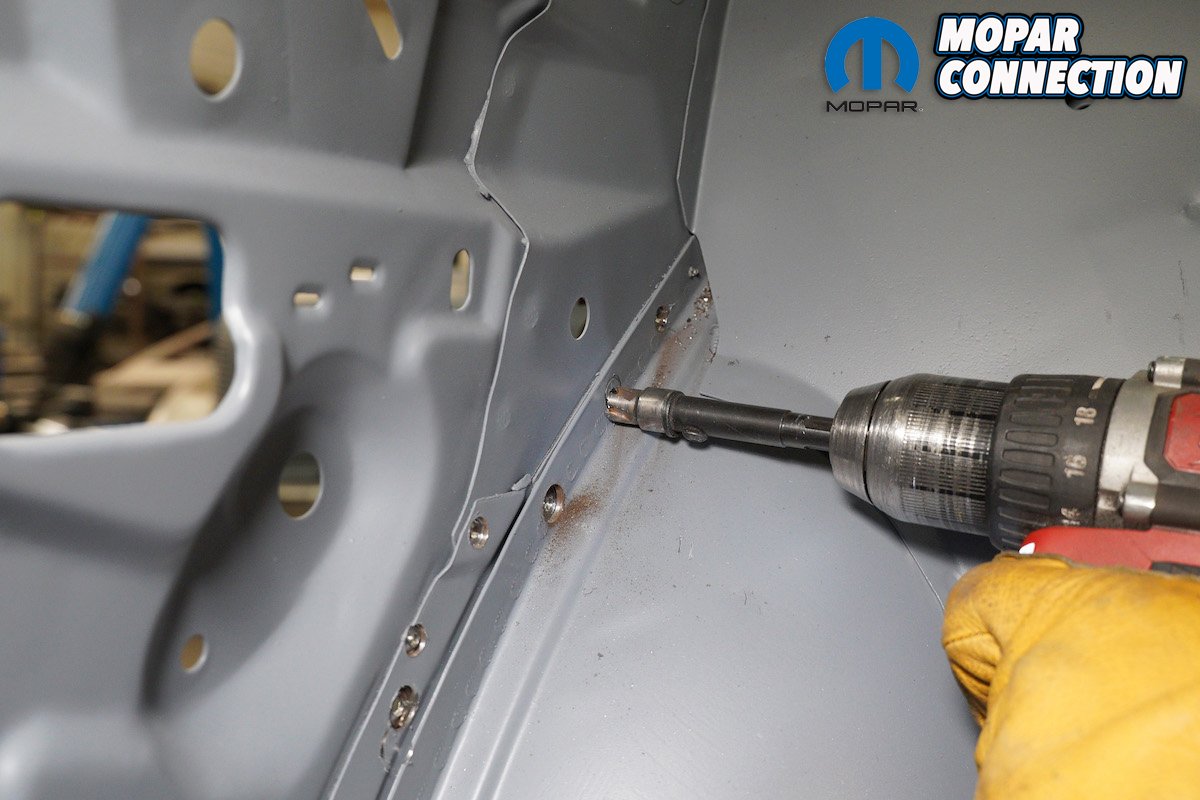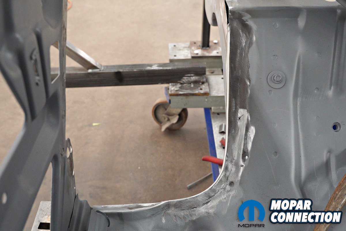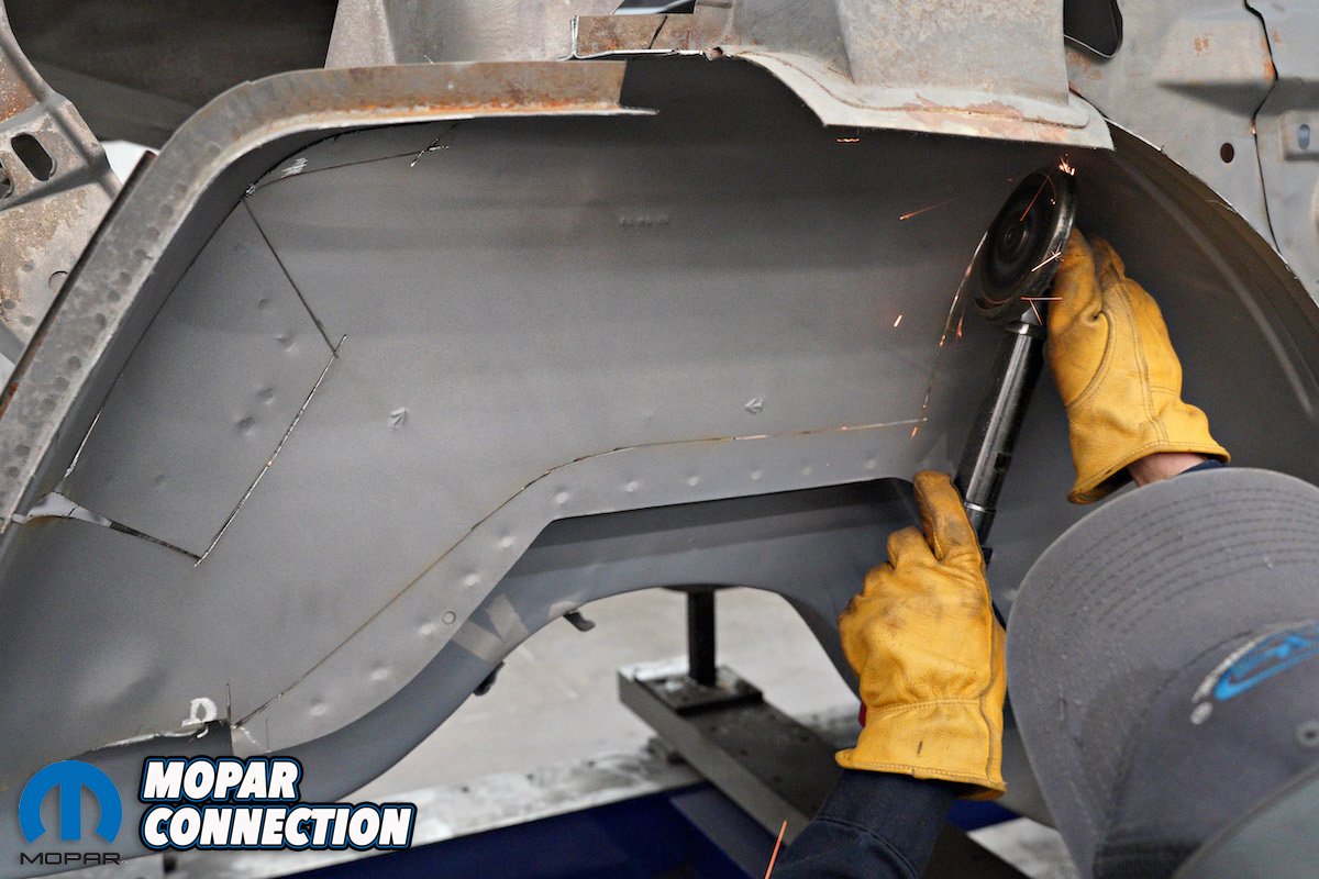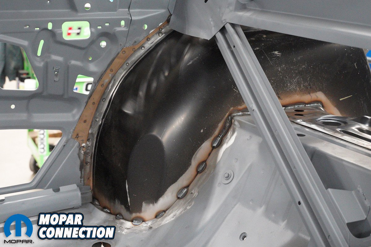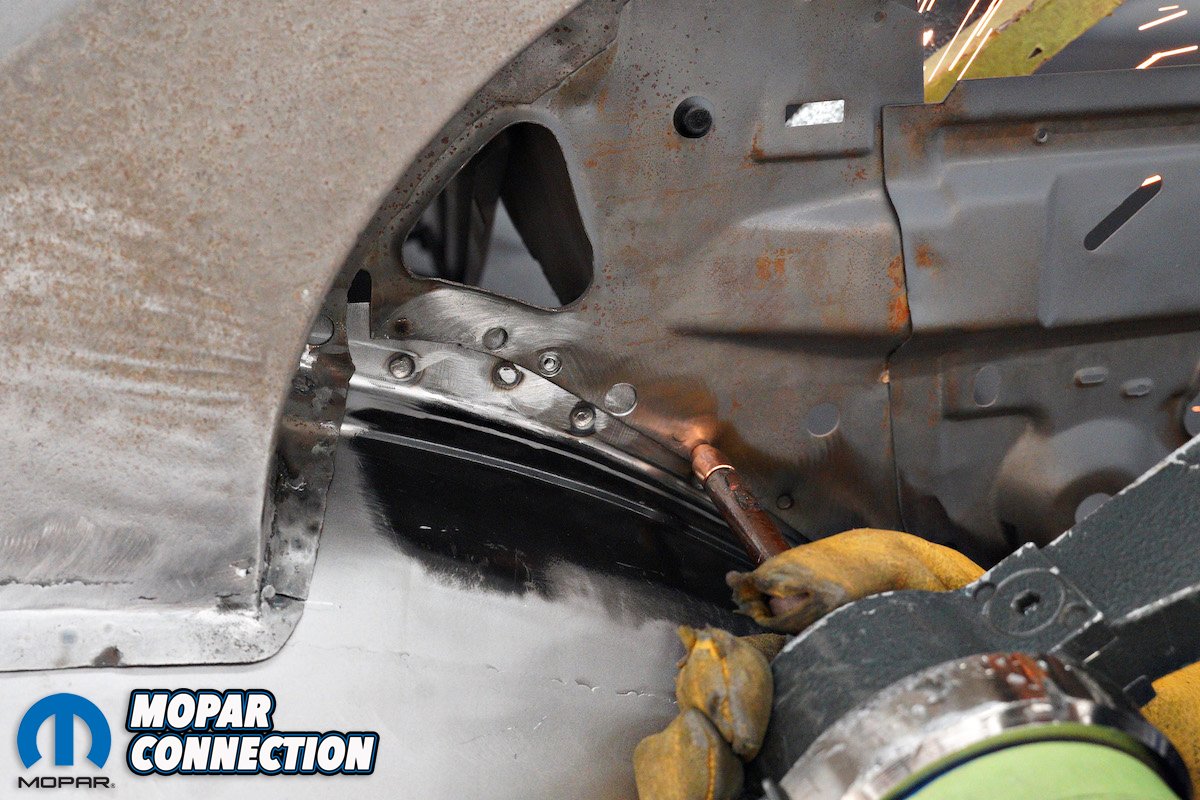 Above left: The floor is not normally welded to the wheel tubs but this will be a high horsepower Hemi car and these welds provide additional strength in this area. Above right: MCR spot welds all panels wherever possible to retain the factory look but plug welds are a perfectly acceptable alternative.