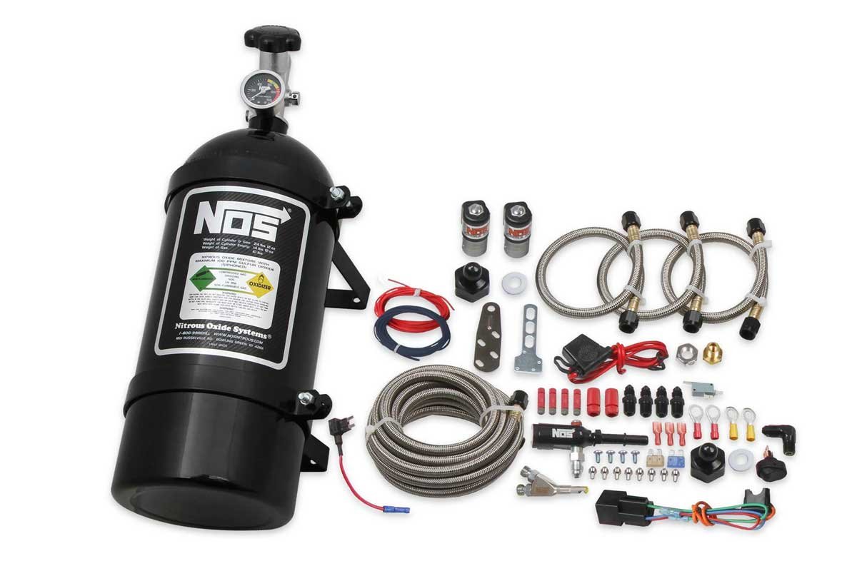 Above Left: NOS has several plate-style kits that work well with carbureted engines. The Big Shot Nitrous System Dominator (Holley 4500 Flange) has a horsepower tuning range between 190 and 300 HP. It has all the hardware, instructions, and a 10lb bottle. Above Right: The NOS Powershot series Nitrous System fits a Holley 4150 and Carter AFB (late-style) and offers up to 125 HP.