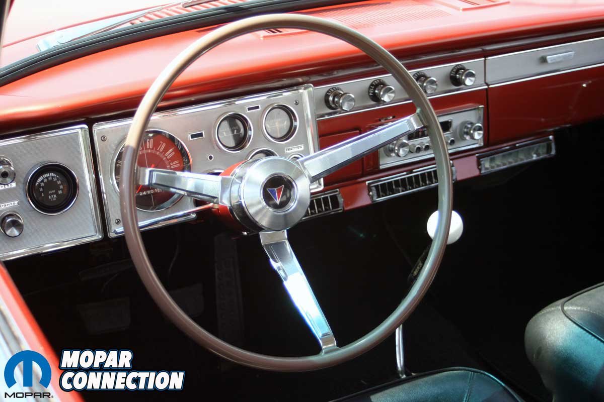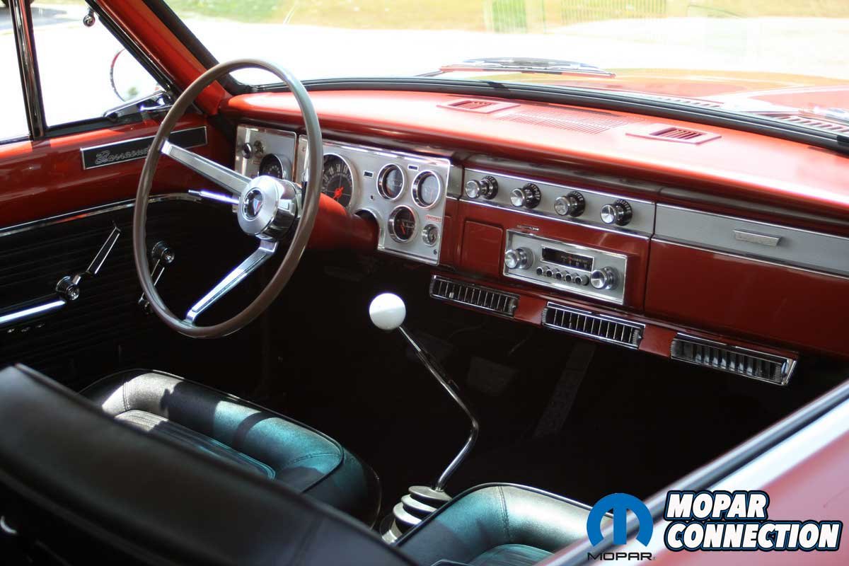 Period-correct touches abound: Cragar SS 14-inch wheels wrapped in BF Goodrich Radial T/As, Kelsey-Hayes front discs with 10-inch rear drums, and a ’64 Barracuda interior with bucket seats, door panels, and dyed rear bench. Air conditioning and a Hurst shifter add comfort and fun, while the fit and finish make it look factory built.