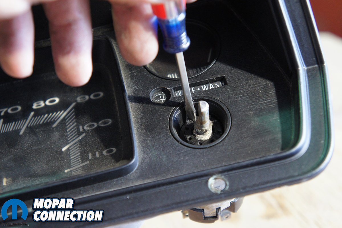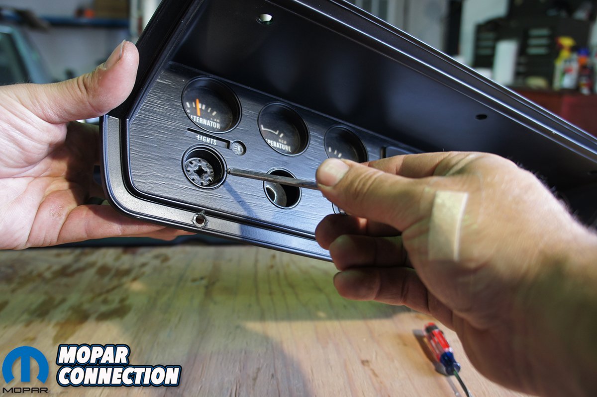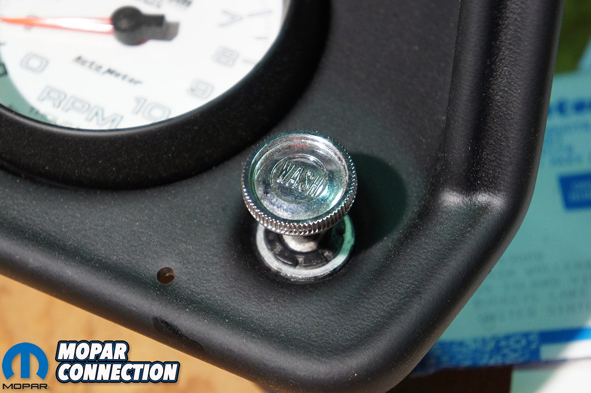 Mounting the headlight switch was fairly straightforward but the wiper switch required a little ingenuity. The spot for the headlight switch was the perfect size to tighten the original switch just like the factory dash. The hole for the wiper switch was oversized and required us to make a small shim. We found a washer that would fit the hole and drilled out the center with a step bit for the wiper switch to fit through. Then we used the washer to mount the original switch to the dash.