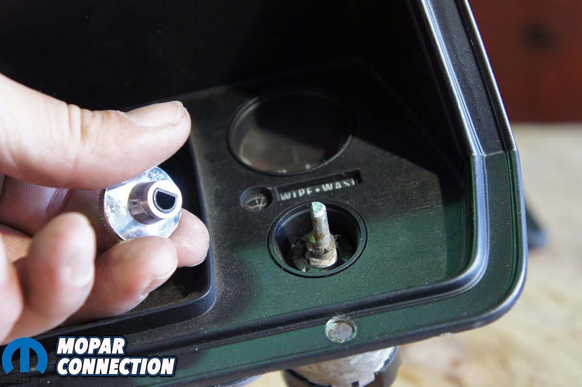 Top Left: The wiper switch differs from the headlight switch and the knob pulls right off. Top Right: Similar to the headlight switch we used a flat screw driver to unscrew the lock nut. Middle Left: To make the wiper switch fit the new gauge panel with found a washer that fit the new gauge panel and drilled out the middle to go around the wiper switch. Middle Right: You can see how the washer fits tight around the wiper switch. Bottom Left: With the washer in place we reinstalled the lock washer for the switch. Bottom Right: With the lock washer tight we popped the knob back on.