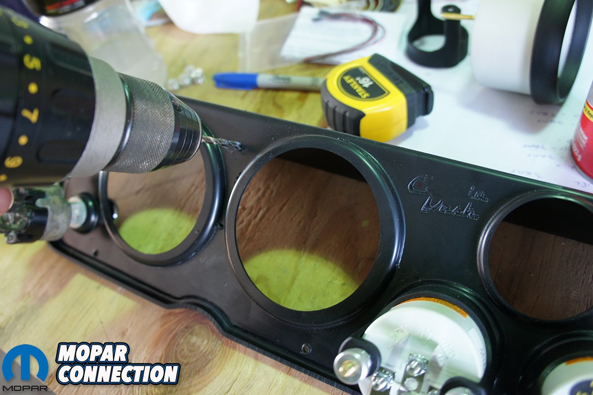 Knowing Classic Dash’s panel was going to fit it was time to drill holes for the LED indicator lights. To maximize space for the gauges on the dash insert, Classic Dash uses LED indicators for your turn signals, bright lights and parking brake. We do not have a parking brake switch anymore so we only drilled 3 holes for our turn signals and bright lights.