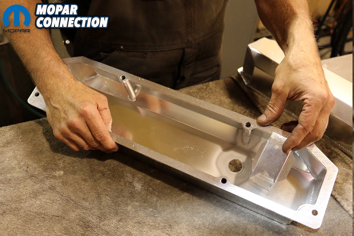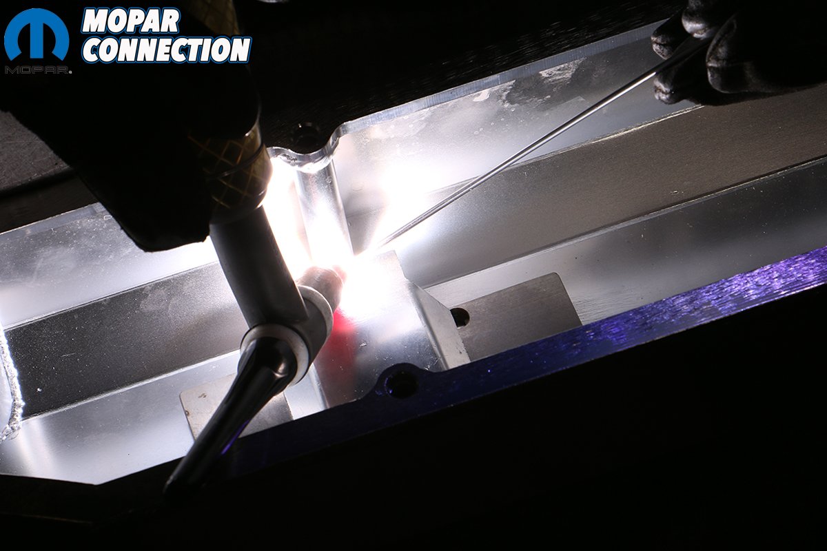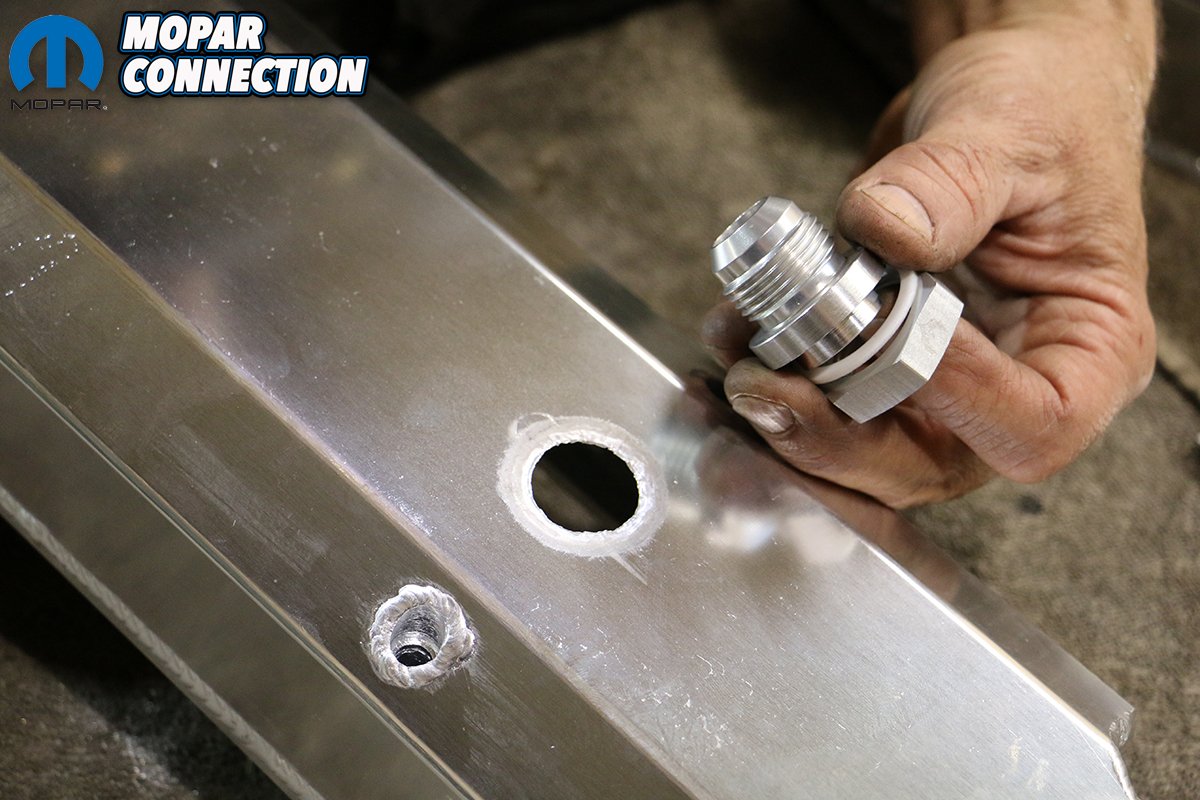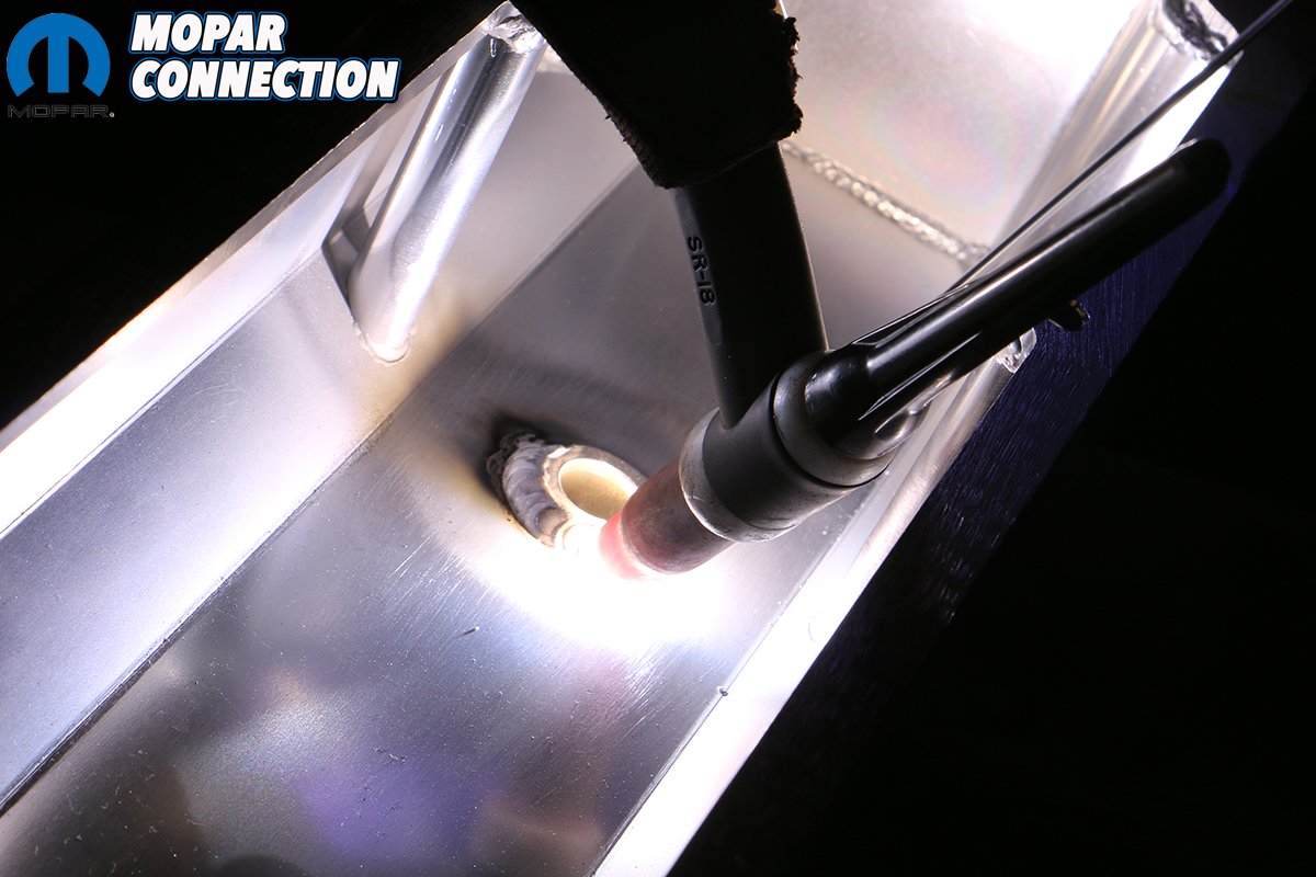 Above: Mopar Connection Magazine Technical Advisor Tray Batey is pretty handy with a TIG welder and handily fused our AN fitting to our new valve covers careful not to burn the coating off of the brushed aluminum covers.