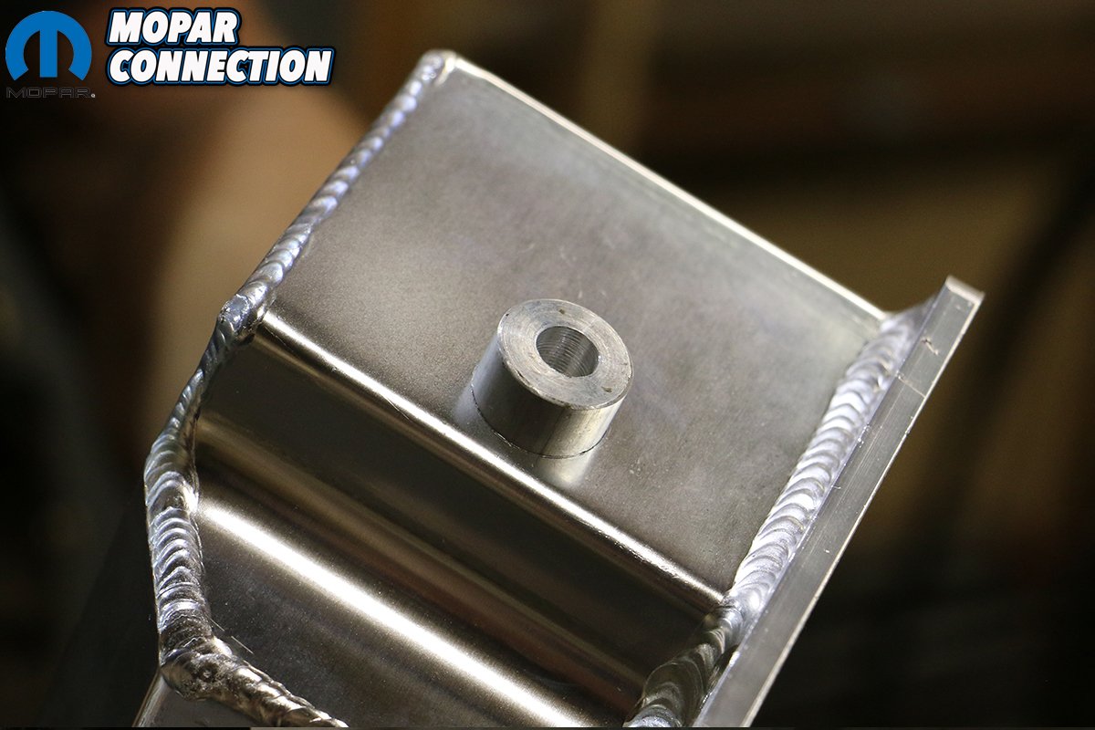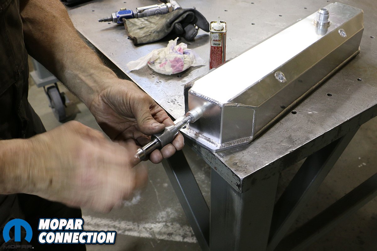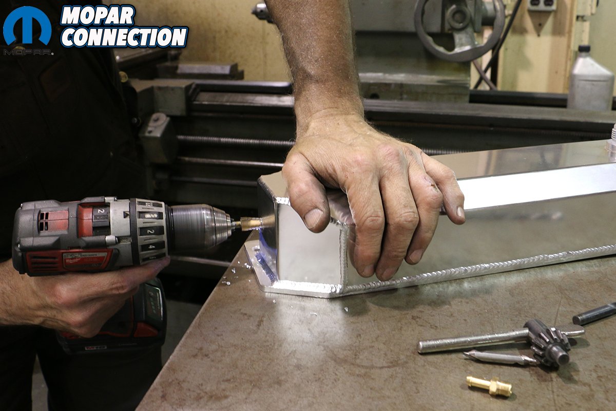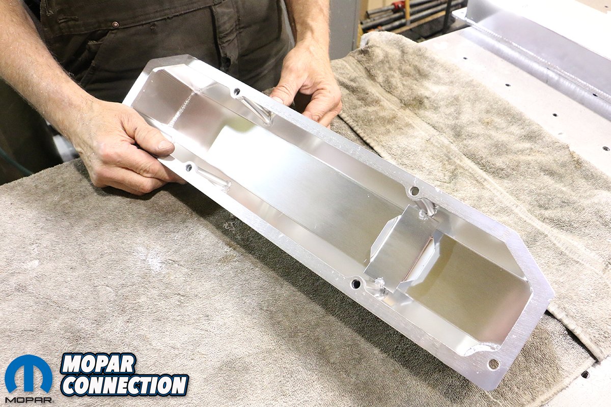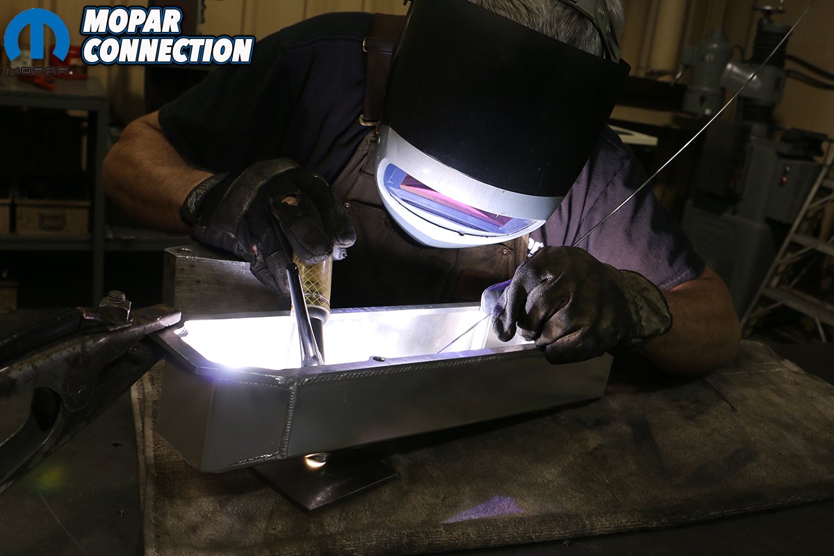 Above: Mopar Connection Magazine Technical Advisor Tray Batey is pretty handy with a TIG welder and handily fused our AN fitting to our new valve covers careful not to burn the coating off of the brushed aluminum covers.