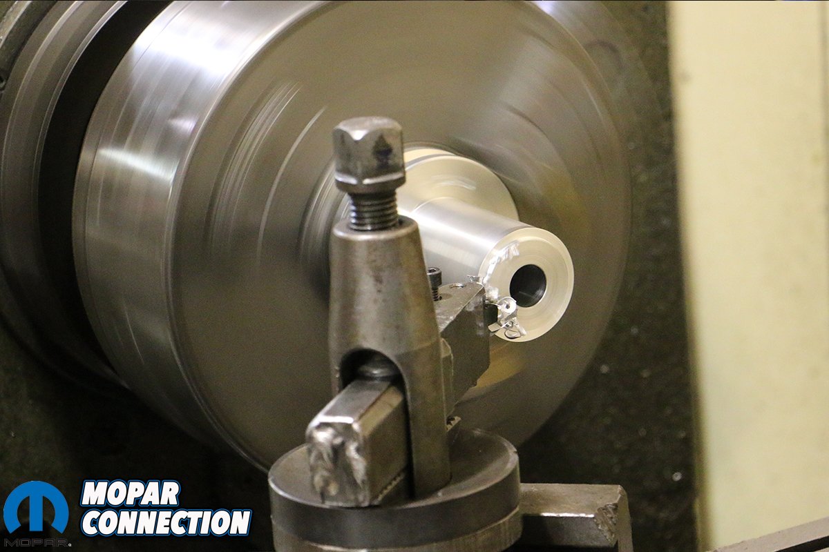 Far left: Because the drive-belt alignment is so precise, GZ Motorsports’ asks for your measurements prior to sending out the billet underdrive pulley. And even if your measurements are off, the mandrel can be easily modified to achieve an ideal alignment between the pulleys. Center left: Batey chucked up the pulley on a lathe and shaved off a few thousandths and even re-drilled the pin hole for the dowel that indexes into the factory accessory pulley. (Center left and Far left)