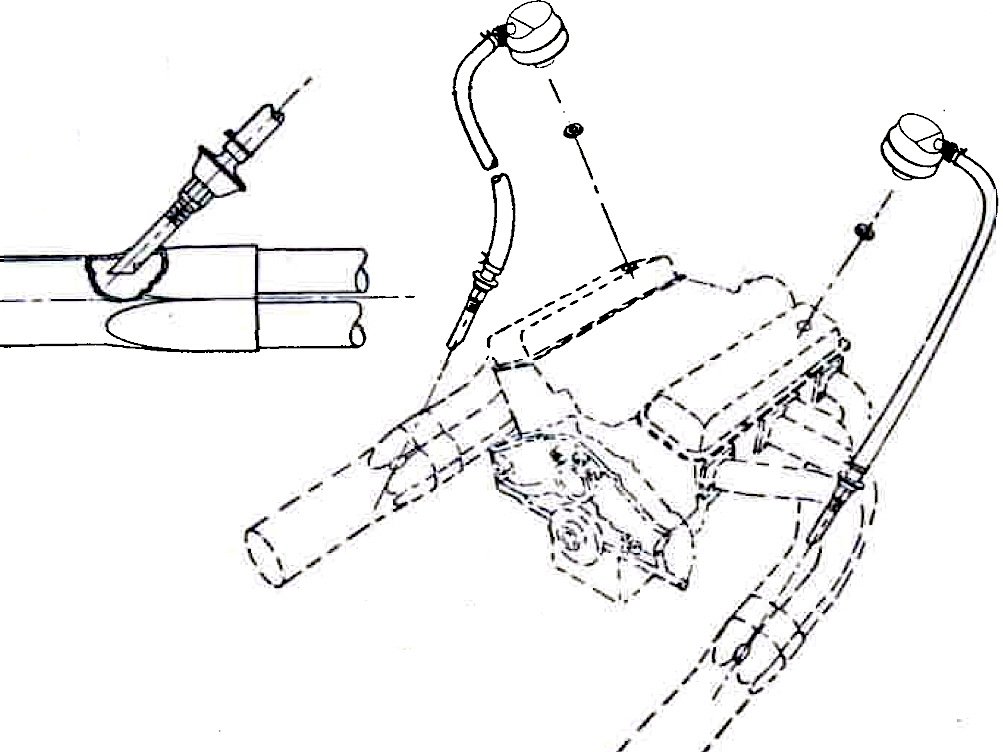 The system itself is ingeniously uncomplicated: a pair of one-way check valves, mounted to an angled tube, are welded into each respective-side’s header collector. The valves are then attached to vent tubes that are fed by breathers attached to the valve covers. The idea is that the passing exhaust gases will draw a vacuum on the tubes, pulling excess crankcase pressure out of the sump and up and out through the collector.