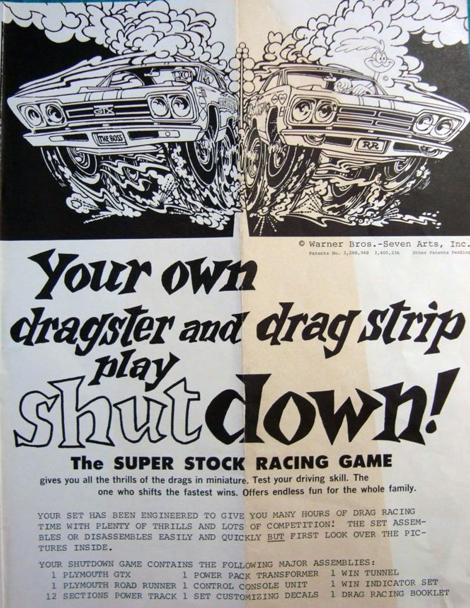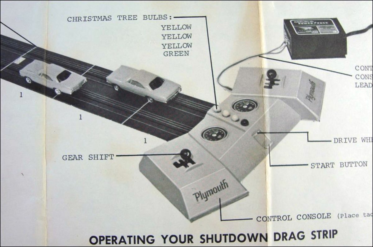 In late 1968, Republic Tool and Manufacturing Co. from Los Angeles, California, manufactured the drag strip set. It included the “Christmas tree” lights, 12-feet of track, power cut-offs (if the car does not meet the proper speed at specific points on the track), and a shutdown area.