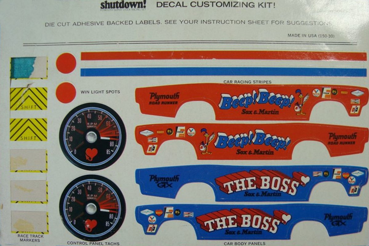 Above Left: The Shutdown! Plymouth Super Stock Racing Set came with two 1/32-scale ’69 Plymouths. (Photo Jeux-autos.fr) Above Right: With the stickers placed on the Plymouths, one is named “Beep, Beep,” and the other is called “The Boss.” Beep, Beep is a Road Runner, and The Boss is a GTX. Both have Sox and Martin logos on them. (Photo Pinterest)