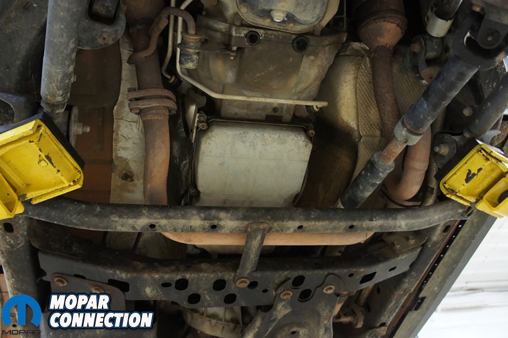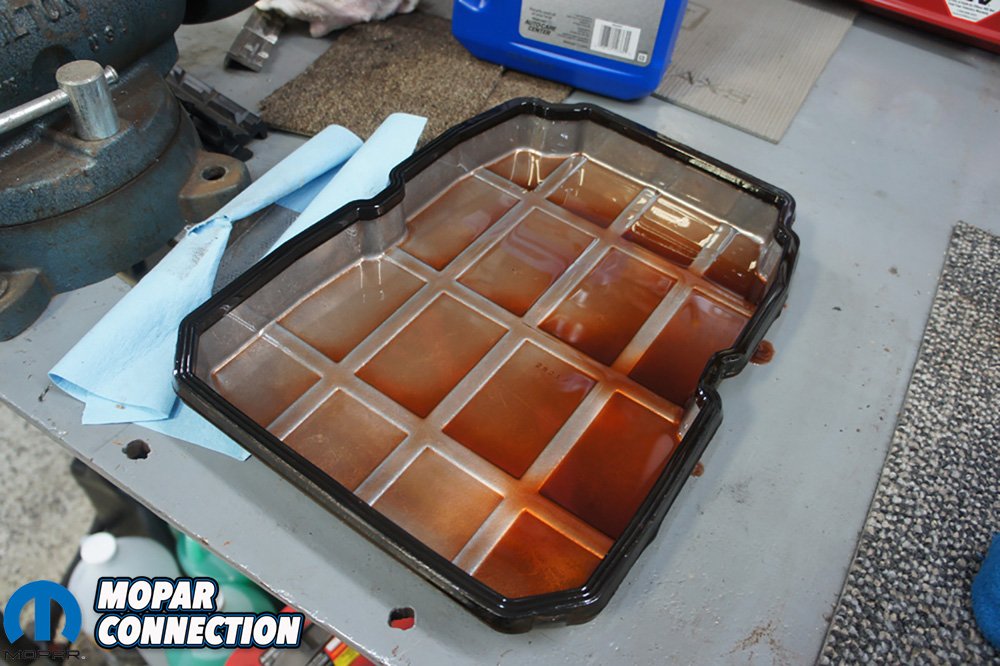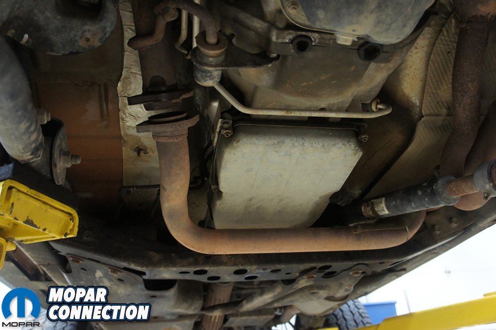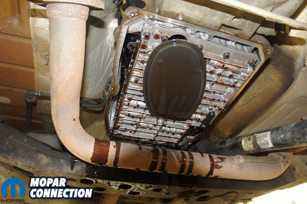 The transmission fluid and filter change is fairly straight forward on our Jeep. Remove pan, drain fluid, install new filter, reinstall pan and fill transmission back up. The biggest issue we run into is the clearance between the backside of the transmission pan and the crossover exhaust pipe. We have pried the exhaust out of the way to get the transmission pan out before, but this is not the proper way and could damage the transmission or exhaust.