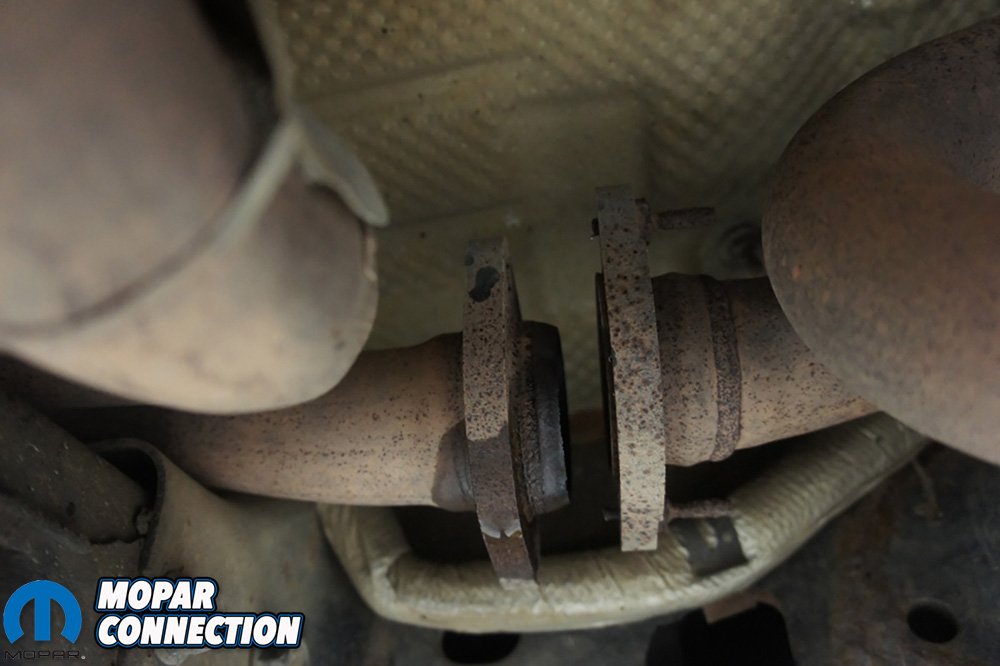 Above Left: Having a lift definitely makes the job easier. Above Right: We did have to remove the small support and then we cut the bolts on our exhaust pipes.