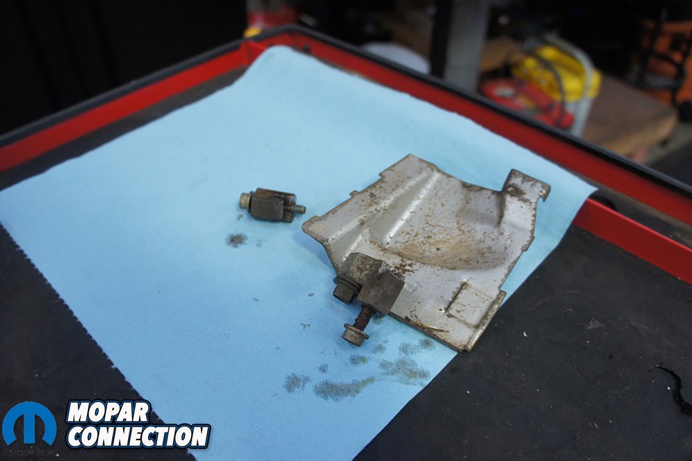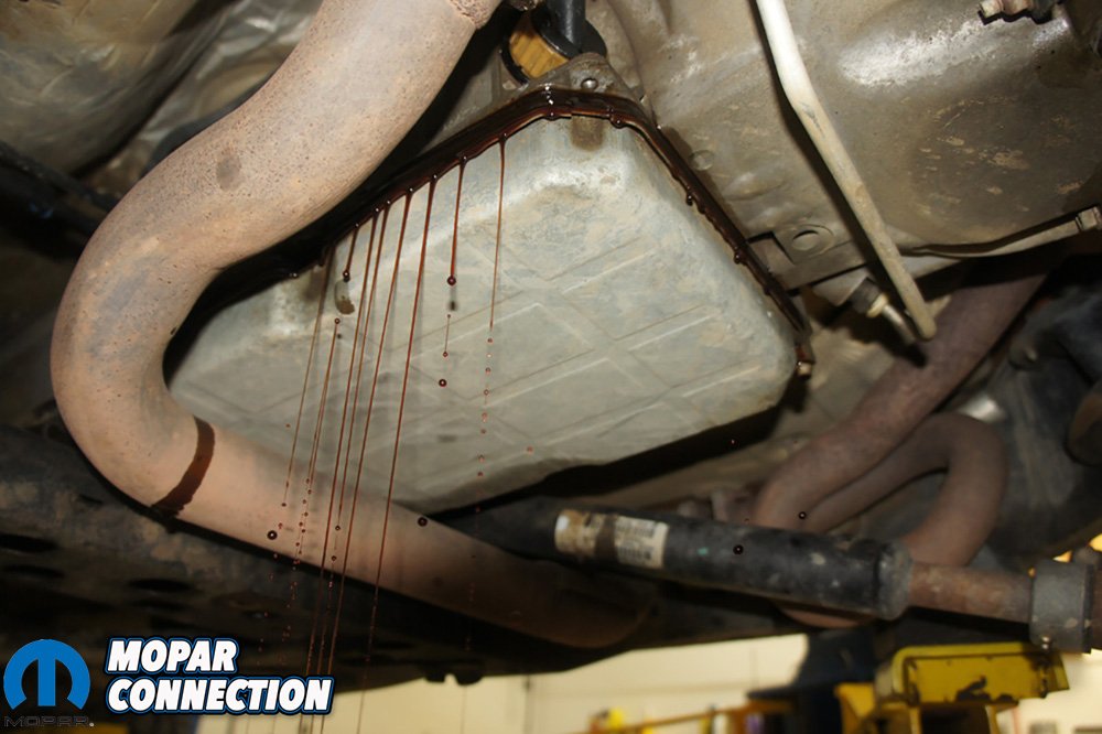 Above Left: You can see the spacers for the pan and a small heat shield that will need to be reinstalled. Above Right: No matter what we do, chasing transmission fluid is always messy.