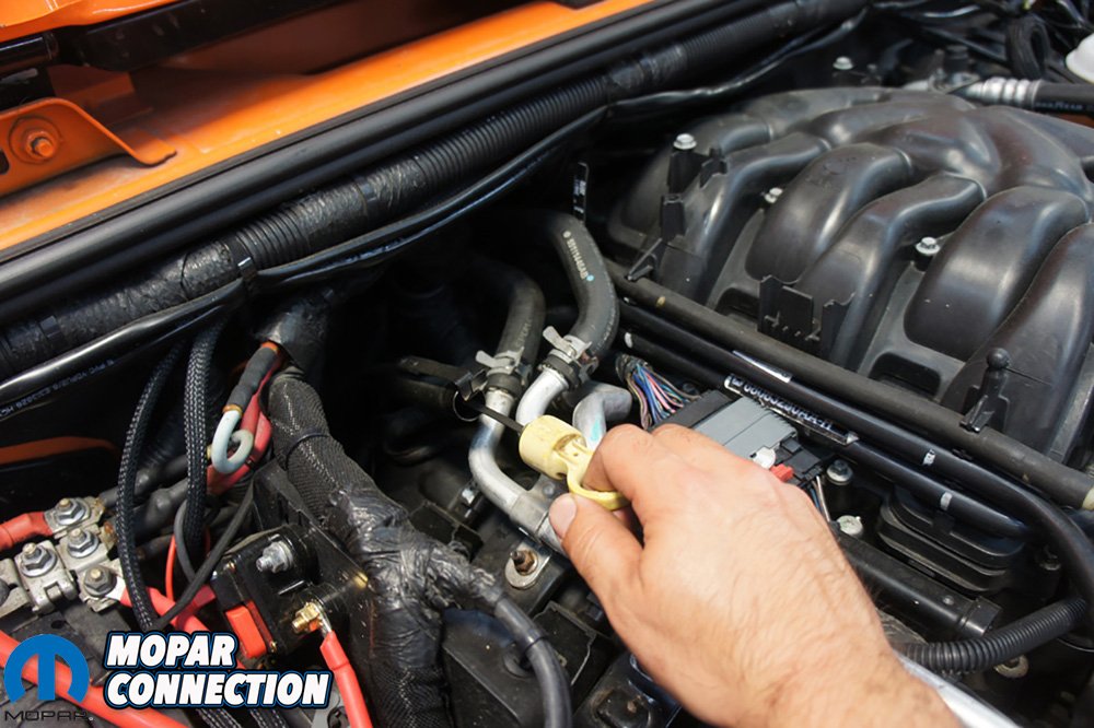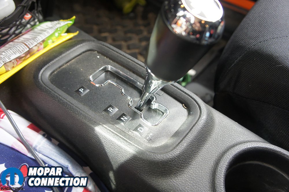 Above Left: once the Jeep was to operating temperature we shifted it to neutral to check the fluid. Above Right: With the transmission in neutral, we pulled the dipstick to check our levels.