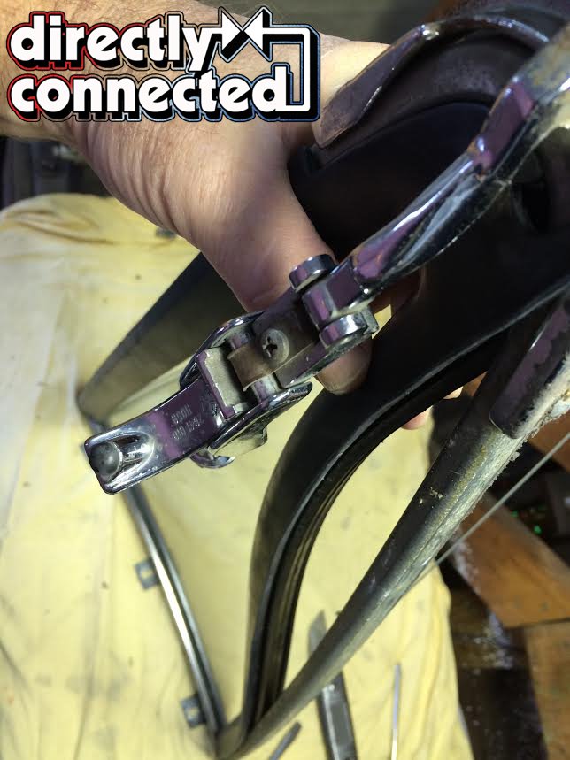 Above left: The “slider” comes with new clips that are used to attach the seal to the new reproduction window. A small rod inserts into one clip before it inserts into the hole in the glass. Cut the new “slider” to fit the glass. Do not leave extra seal longer than the actual glass length. Trim with a razor blade or scissors being careful not to crush or damage the plastic “slider.” Above center: While holding the “slider” in place punch a hole with a small awl or pointed punch completely through both sides of the “seal” where the glass mounting hole is located. Position the two clips and squeeze them together with a pair of pliers. Make sure the clips seat all the way in the glass hole. Above right: When installed correctly the outer part of the “slider” will wrap completely around the clip then the glass and the “slider” will move freely inside the stainless channel.