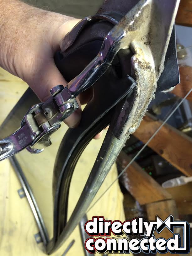 Unscrew the mechanism in the rear that opens the window. Inspect it and see if it needs to be replaced. After the hinge is separated from the window, the glass can open wider enabling you to remove the big rubber U-shaped seal. Always replace this seal with a new reproduction piece. The seal is only held in place by a channel that the seal snaps into. There aren’t any clips or hardware holding the seal in place. Just pull the seal out.
