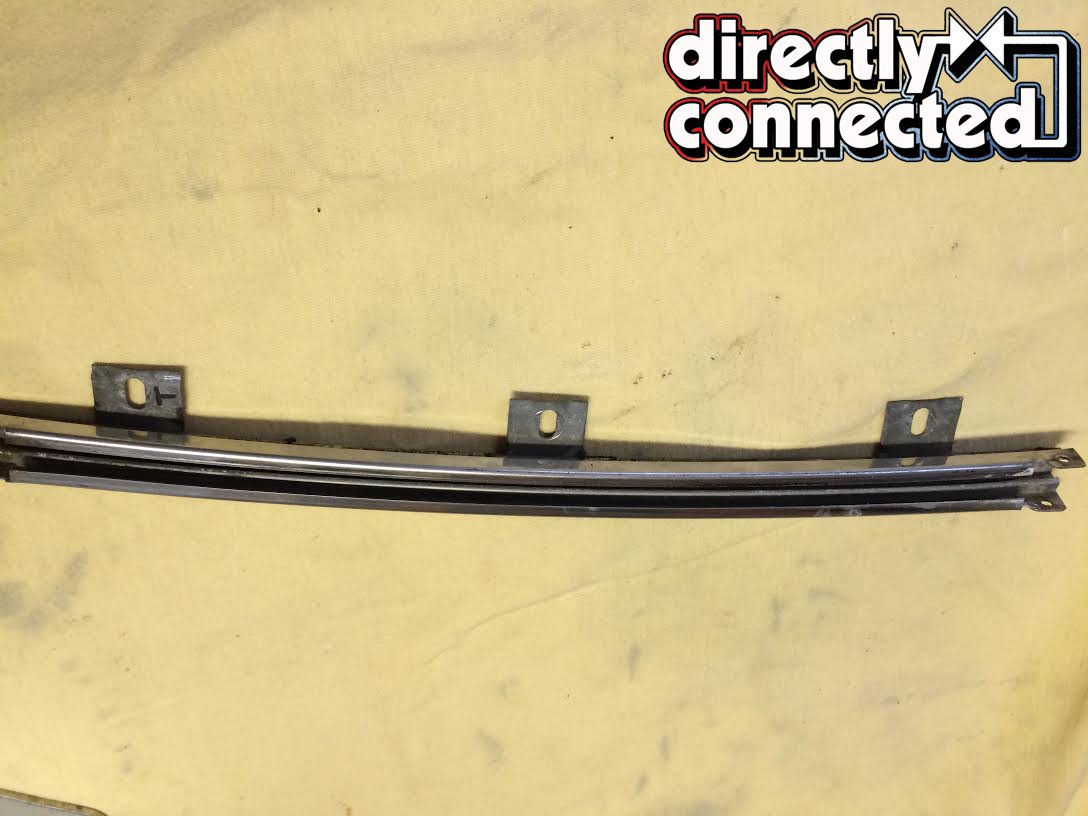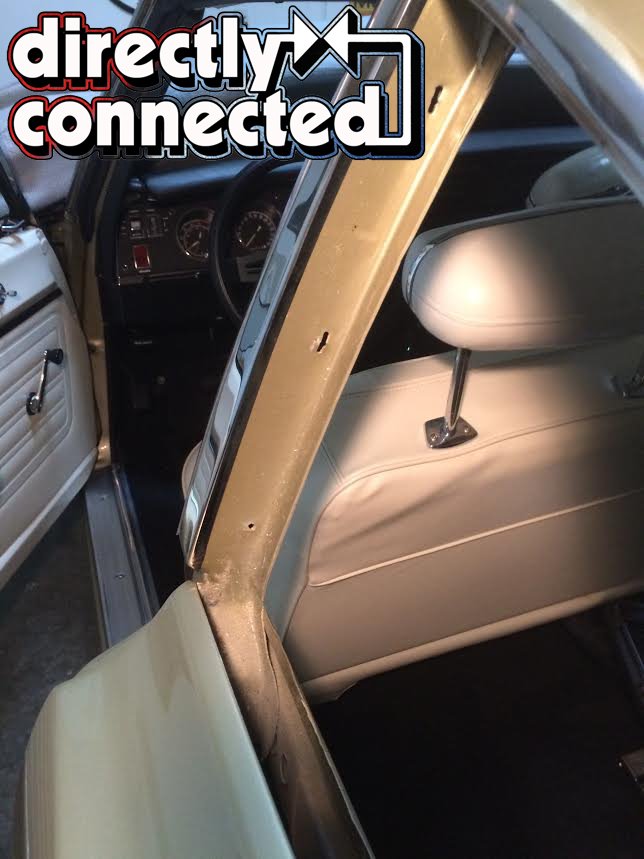 Above left: These are the three attaching points that are drilled into the door pillar on a post car. Only post cars have these pop out windows. Above right: A common mistake that is made on these cars is not installing the drip rail molding, especially the curved end, before installing the upper seal channel stainless. The drip rail end has a tang that must be installed before the upper seal stainless. If you didn’t do it in this order when you go to install the drip rail molding, you will have to take everything back apart including the pop out window assemblies.