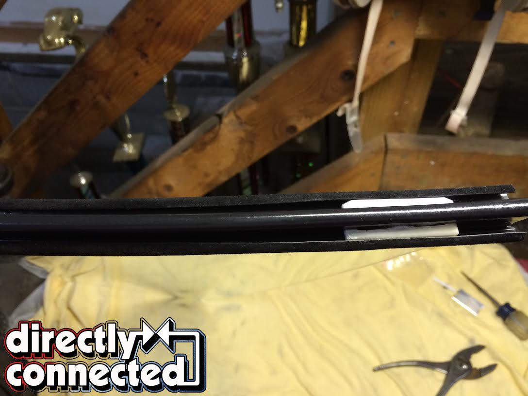 The “slider,” which is made from plastic and felt, is the same part that is used on the front of the door glass. You will need to purchase one for each side. They are available but they’re not cheap. Place the slider on the new reproduction glass and cut to length. With an awl, punch out a hole where the two plastic clips attach with a small rod that connects them together through the hole in the glass. These clips will squeeze together with pliers.