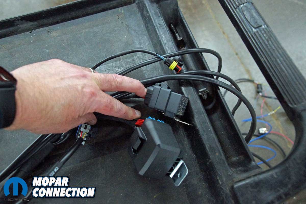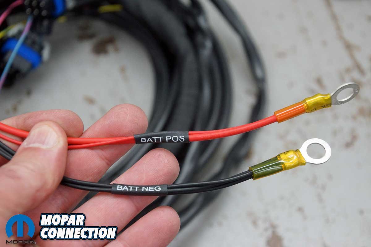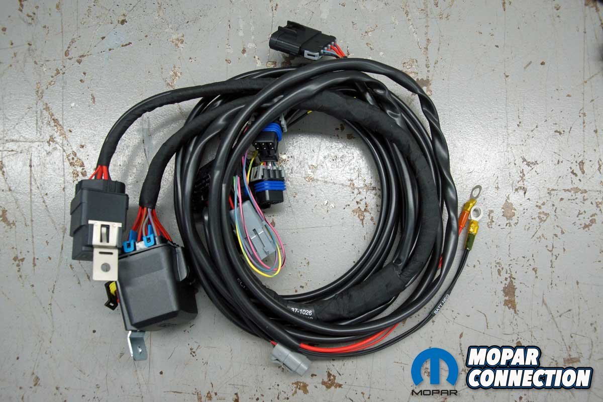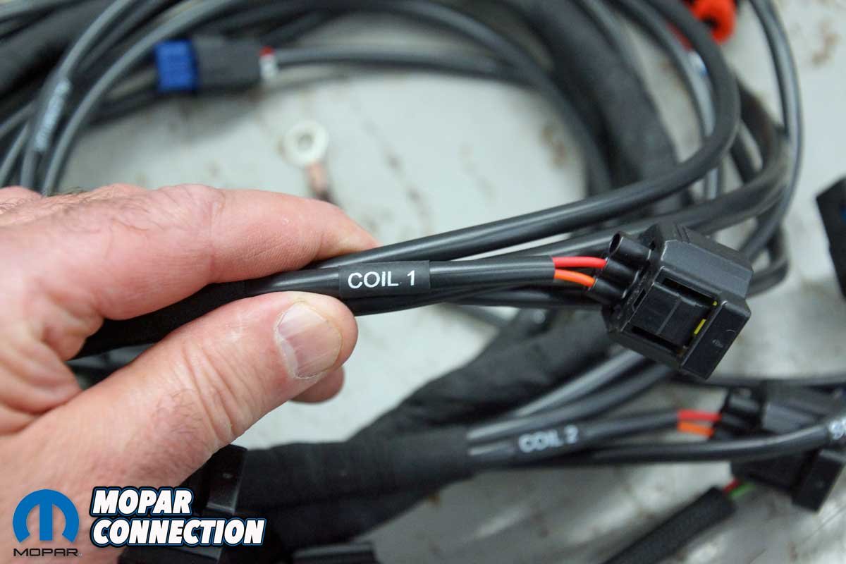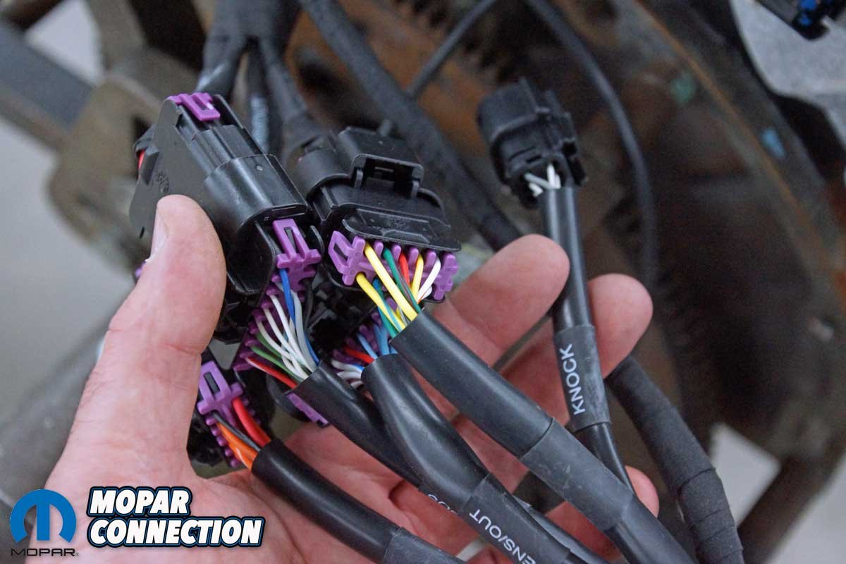 Above Left: The harnesses are clearly labeled for each component on the Hemi. Above Right: Only two connections are necessary to power up the EFI kit.