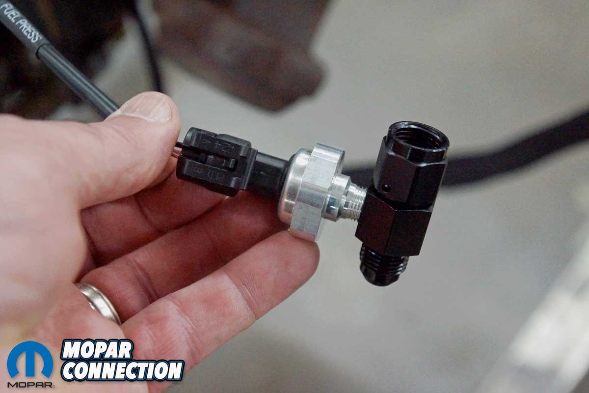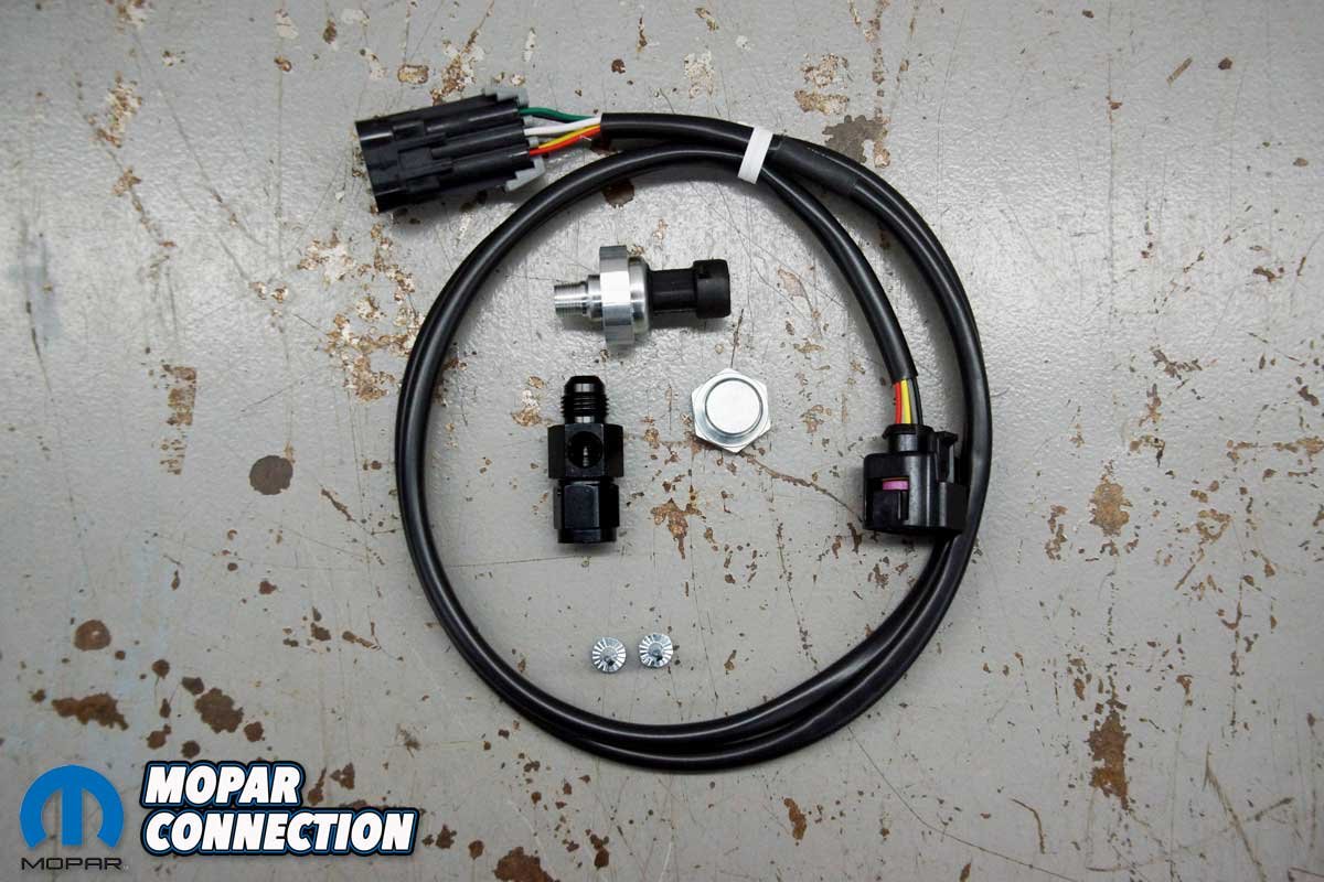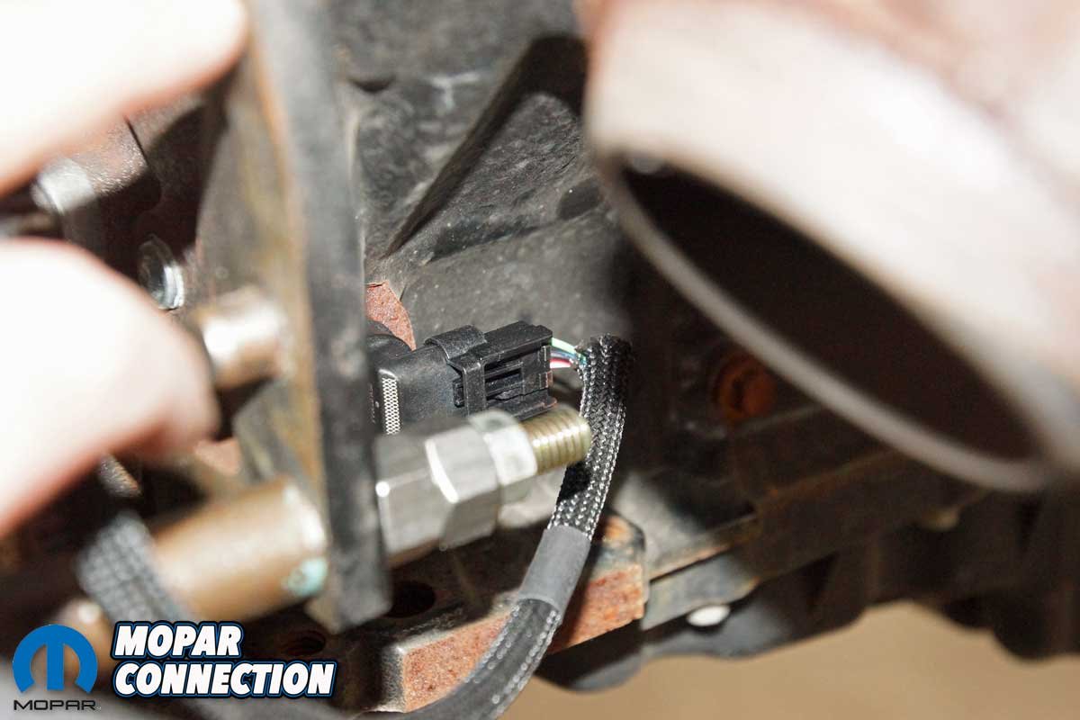 Top Left: The IAT would be found in the intake air ducting, but in our case, it is just connected to the harness. Top Right: At the passenger’s side of the block, we attached the crankshaft position sensor. Bottom Left: We tied the included pressure transducer into a fuel line fitting. Bottom Right: The Bosch O2 sensor would need to be installed into the Hemi’s exhaust.