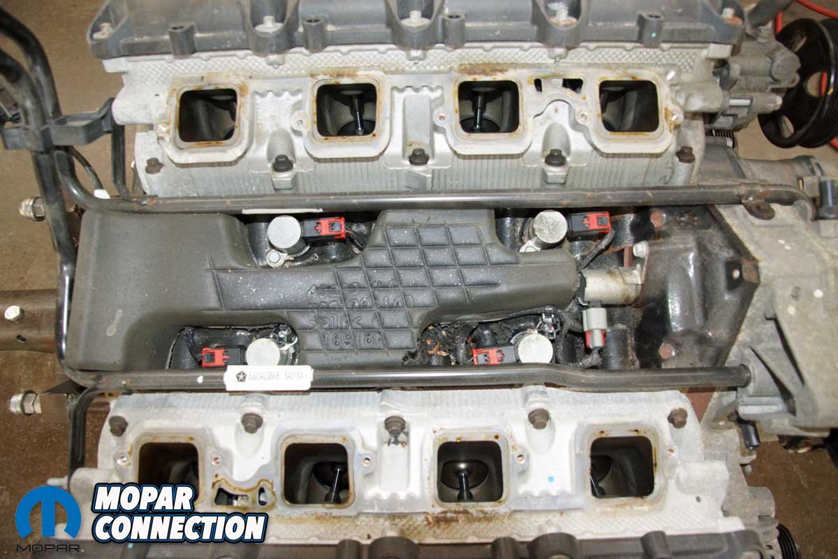 Before we started, we stripped the engine of the radiator and heater hoses and removed the emissions lines from the intake manifold. Then, with the non-essential (for our testing) components out of the way, we unthreaded the intake manifold bolts and removed the manifold to gain access to the four MDS solenoids.