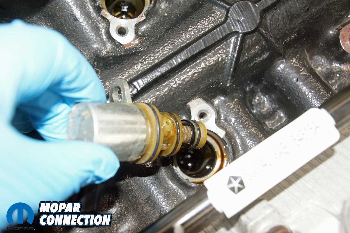 To fill the solenoid holes, we installed the MDS delete plugs. The plugs are sufficient for the delete, but if a new stock camshaft is being installed, this would be a great time to replace all the roller lifters with non-MDS lifters. With the plugs in place, we connected the sub-harness to the VVT solenoid and routed the wrapped wires under the factory foam insulation toward the rear of the engine.