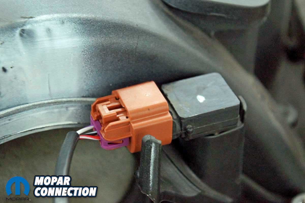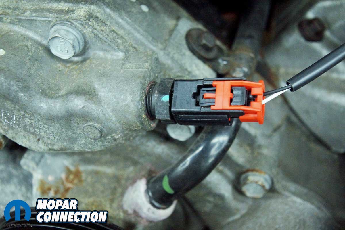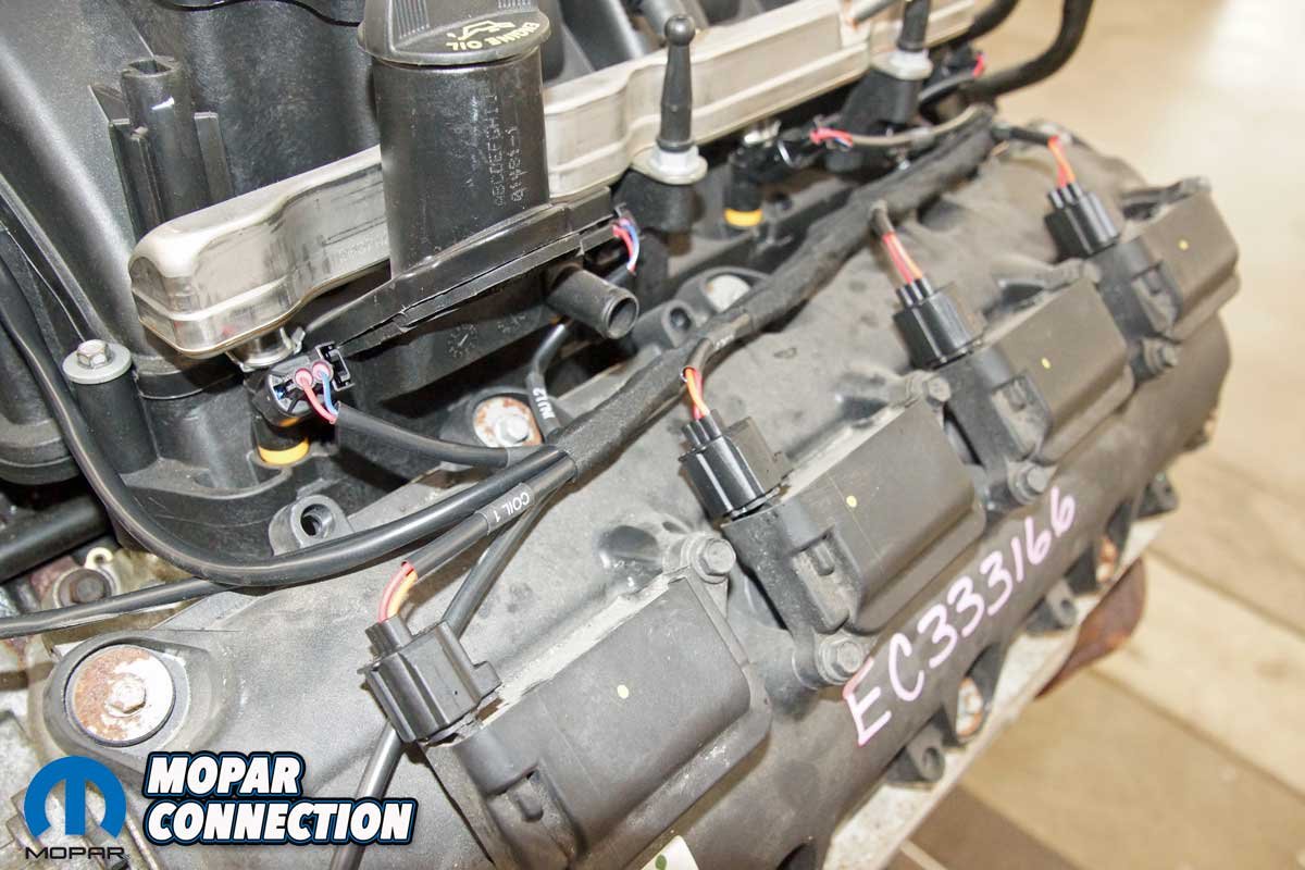 Above Left: We connected the VVT wiring and routed the harness under the insulating foam with the plugs in place. Above Right: The VVT is found on the 2008+ Hemis. With it attached, the EFI ECU can control the valve timing.