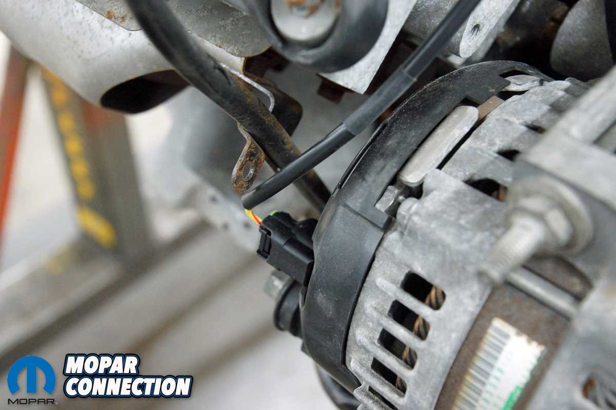 Top Left: At the front of the engine, we attached the ECT sensor. Top Right: The harness stretched to the cam position sensor on the passenger’s side of the Hemi. Bottom Left: We installed the black connector to the factory alternator. Bottom Right: The oil pressure sender connector was snaked between the alternator and the engine’s front cover.