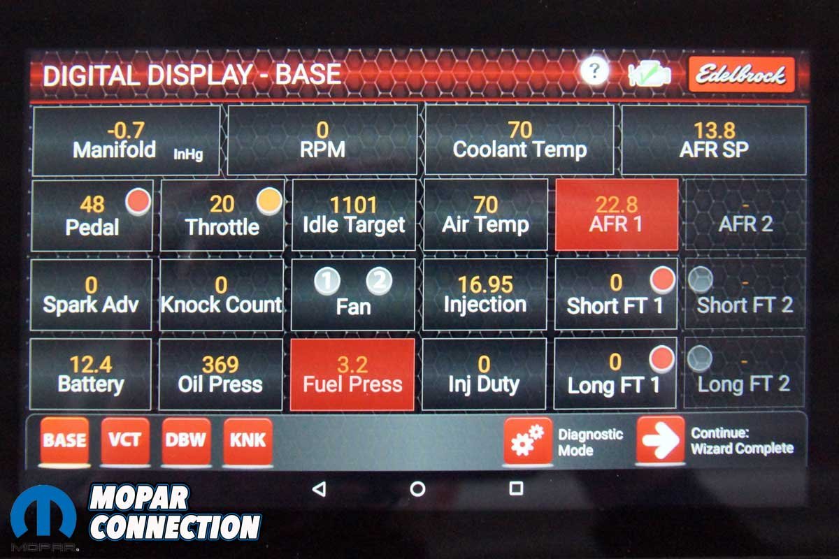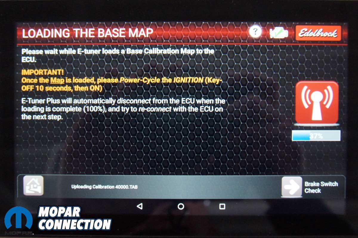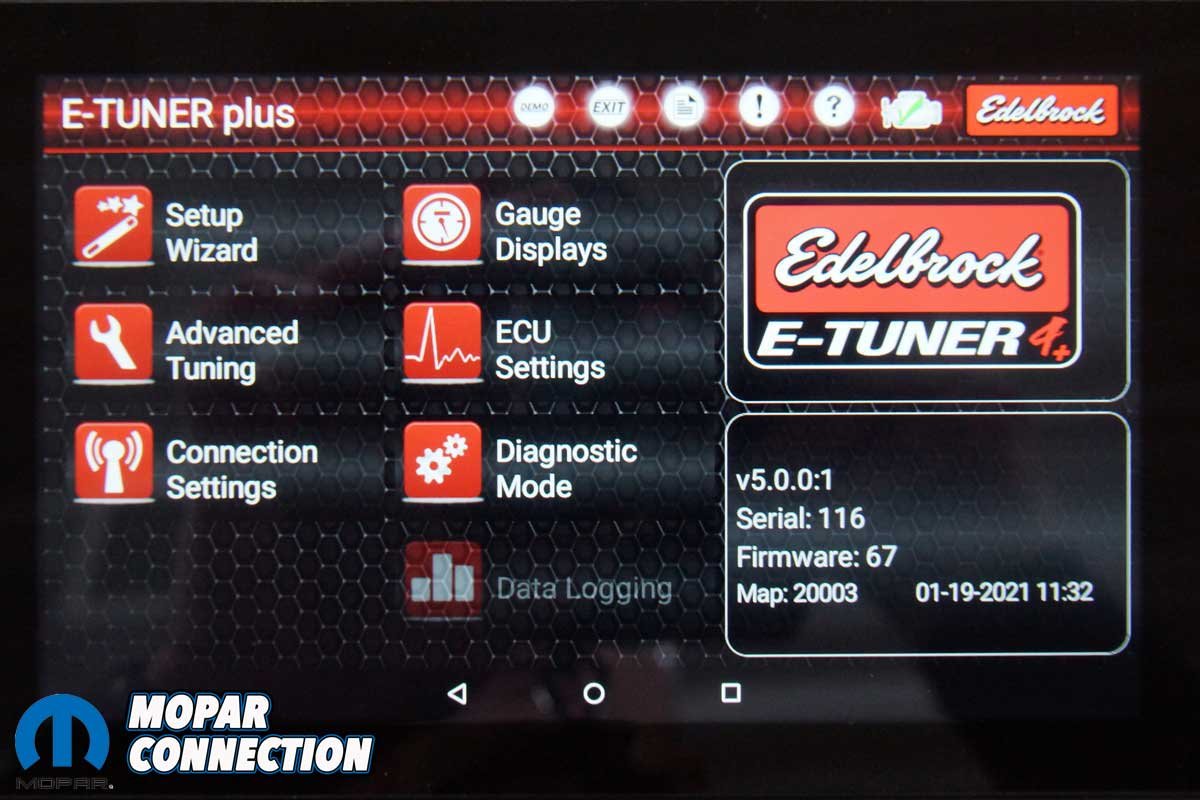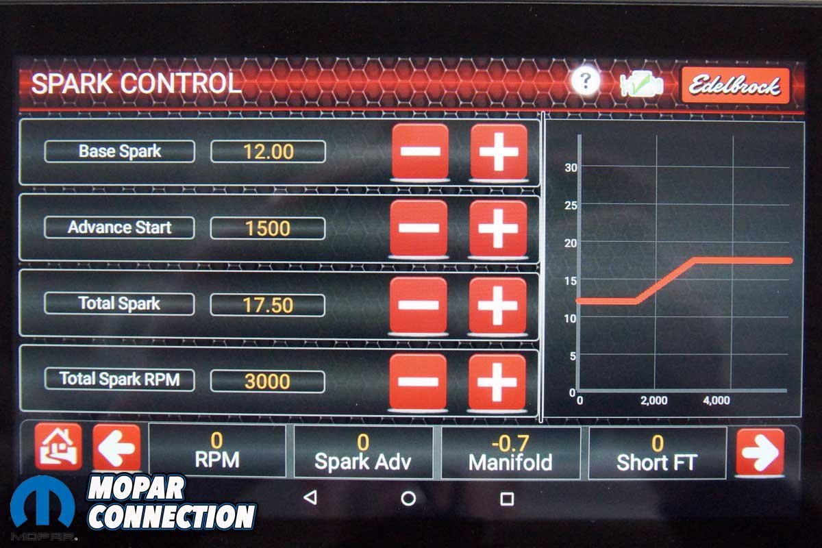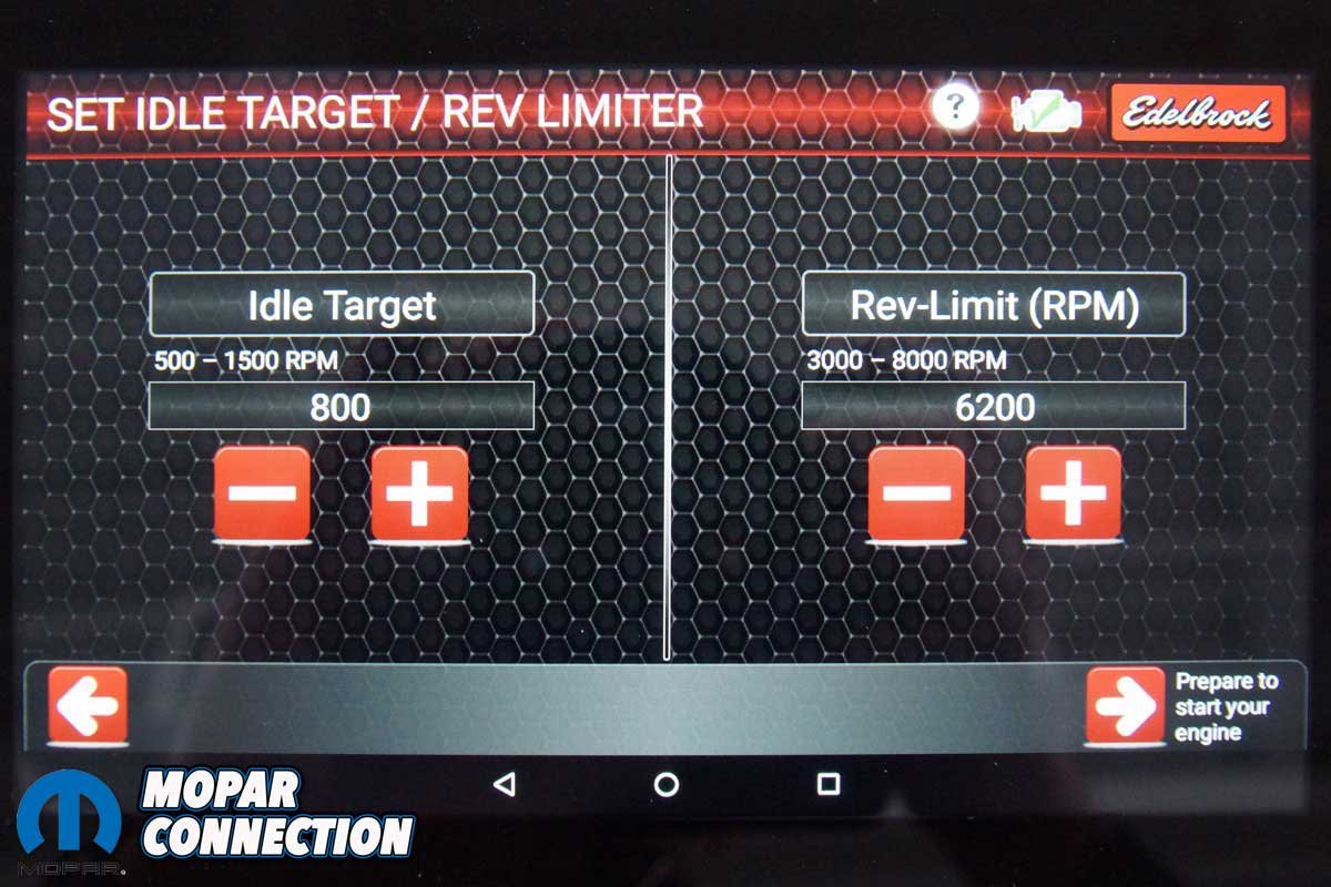 Edelbrock has designed an electronic control unit (ECU) and wiring harness for the engine. The Hemi is wirelessly programmed, monitored, diagnosed, and calibrated via a Bluetooth-controlled touch-screen tablet.