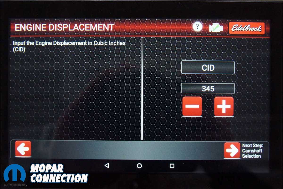 Next, we entered the engine’s displacement by depressing a plus or minus button. There was a single option for the camshaft with less than 210° of duration, and the only option for fuel injectors was the 27.5 lb/hr units.