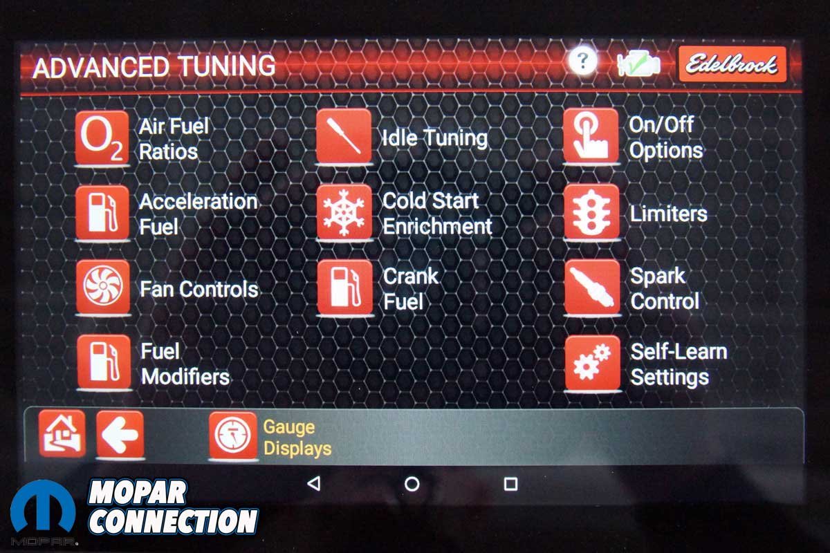 Above Left: While poking through the plethora of screens, we took note of the sensor inputs. Above Right: For additional tuning, Edelbrock provides pages of advanced tuning options.