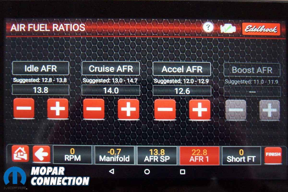 Above Left: After answering all the calibration questions, the Pro-Flo 4+ software loaded the base map. Above Right: We were allowed to adjust the base map parameters to fine-tune the Hemi for peak performance. For example, we could increase or decrease multiple parameters such as rpm by tapping on the (-) or (+) buttons.