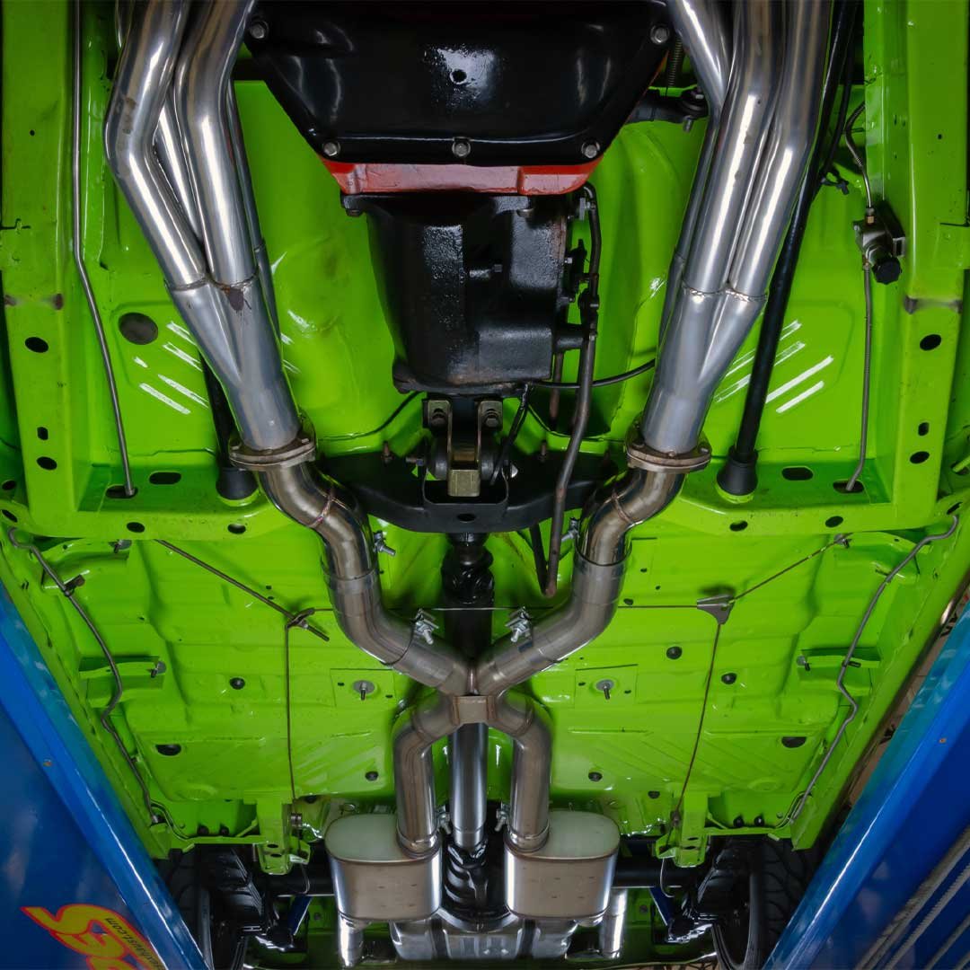 The X-pipe arrangement refines exhaust-pulse timing, improves scavenging efficiency, and stimulates a balanced flow path between the cylinder banks. The result is a deeper, smoother exhaust tone with reduced harshness, improved tonal clarity, and a refined acoustic character that seizes the essence of the muscle car era.