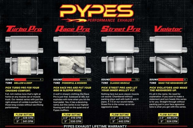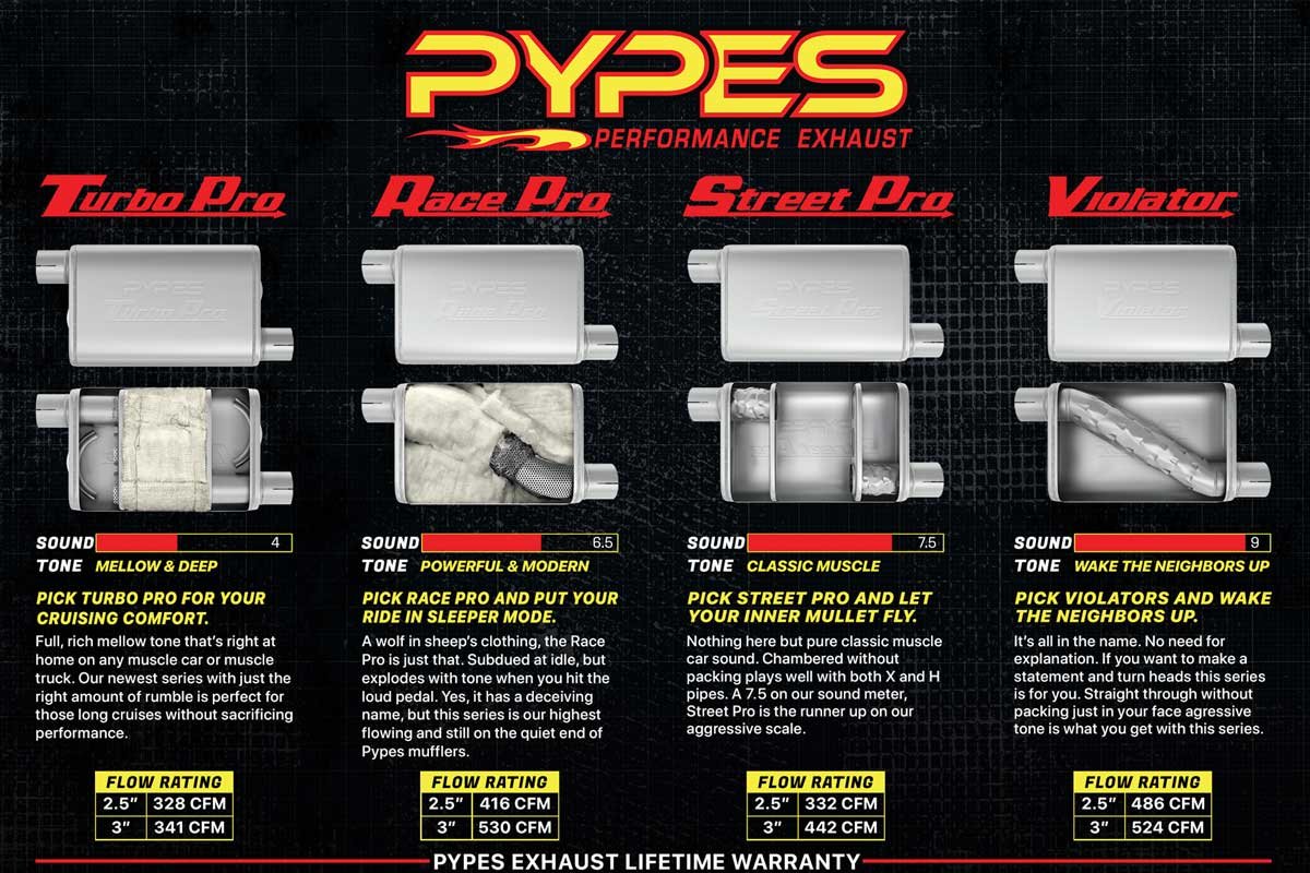 Sound character remains a clarifying attribute of any performance exhaust system, and Pypes provides a range of muffler options tailored to each enthusiast’s preference. Turbo Pro mufflers deliver a subdued, classic tone with minimal interior resonance, perfect for long-distance cruising. Street Pro mufflers deliver a more powerful exhaust presence with restrained aggression, ideal for spirited driving.